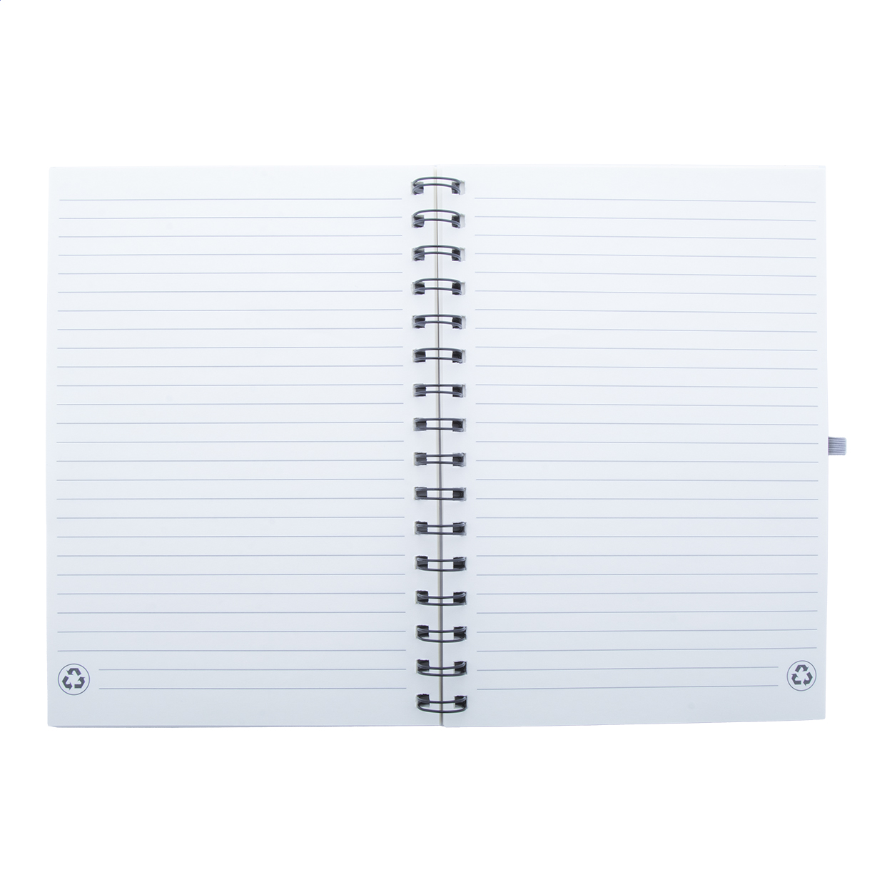Quaderno a spirale formato A5 con copertina in feltro RPET e sughero naturale, 70 fogli a righe in carta riciclata, cinturino in gomma e portapenne.