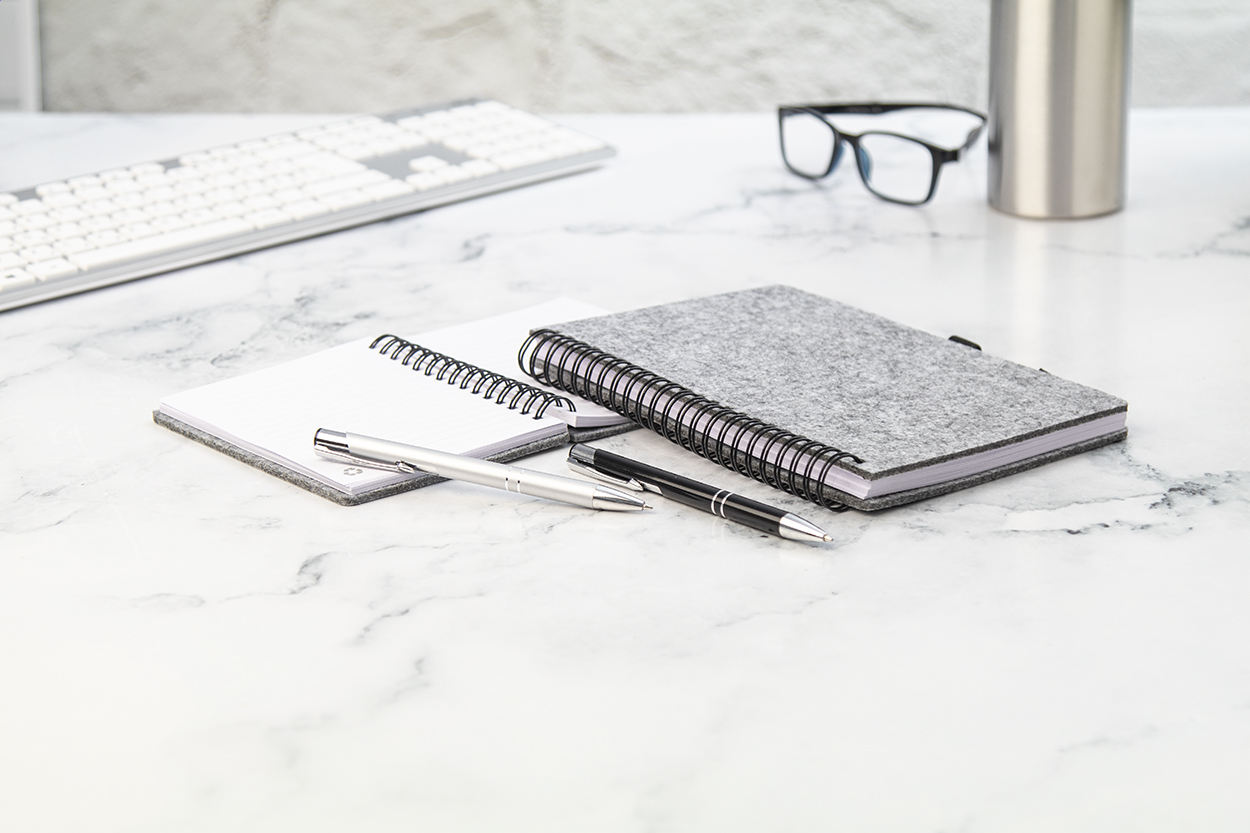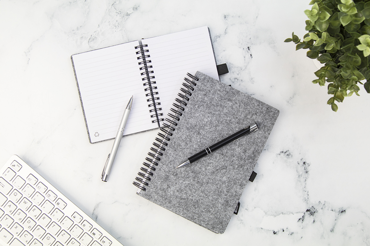 Quaderno a spirale formato A5, con copertina in feltro RPET, 80 fogli a righe in carta riciclata ed etichetta RPET.