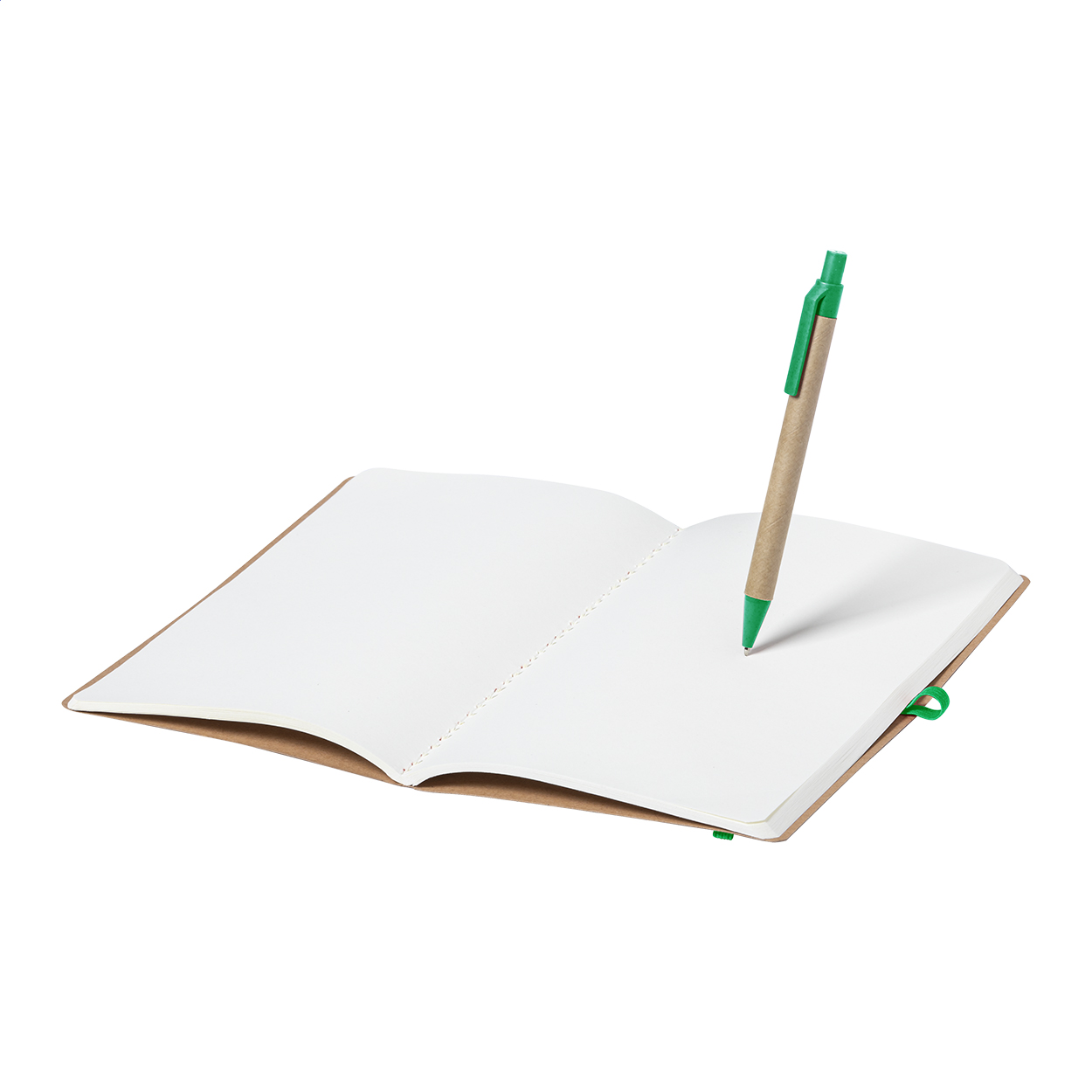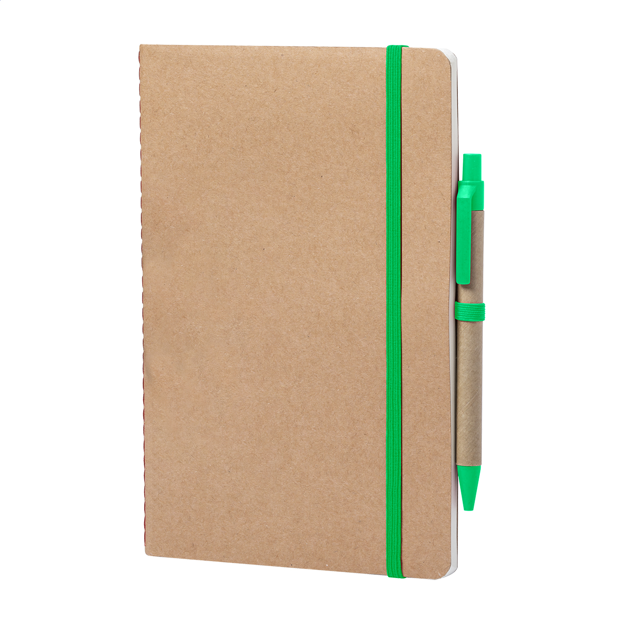 Quaderno ricoperto di cartone riciclato con 60 fogli bianchi e cinturino in gomma colorata, formato A5. Compresa una penna a sfera in plastica di paglia di grano con refill blu.