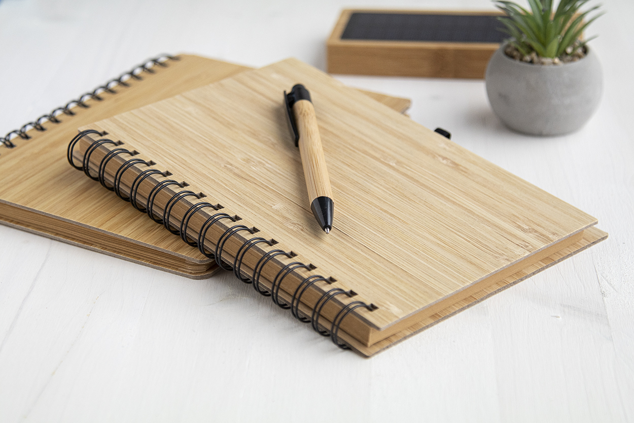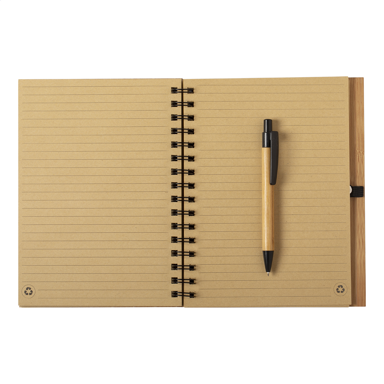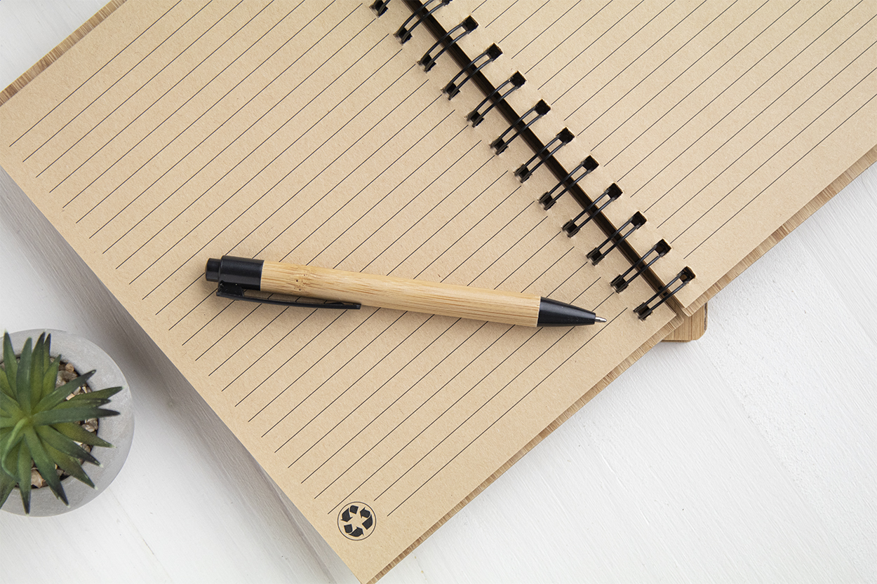 Quaderno a spirale con copertina in bambù. Penna a sfera in bambù con refill nero compresa. 80 fogli a righe, formato A5.