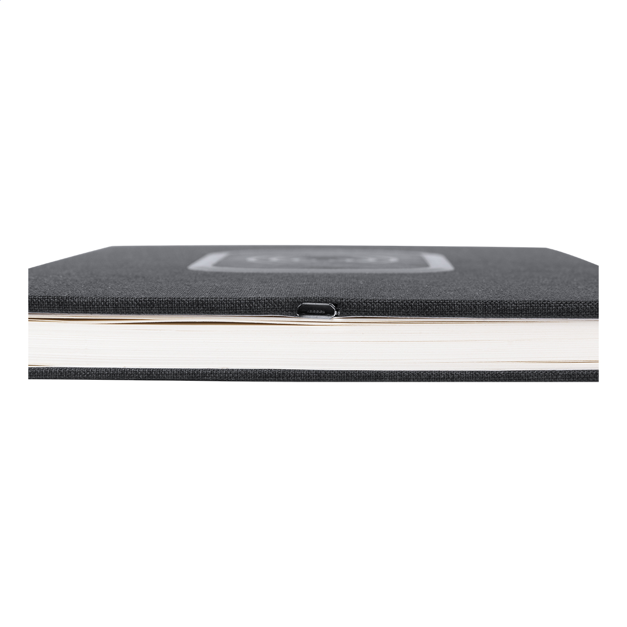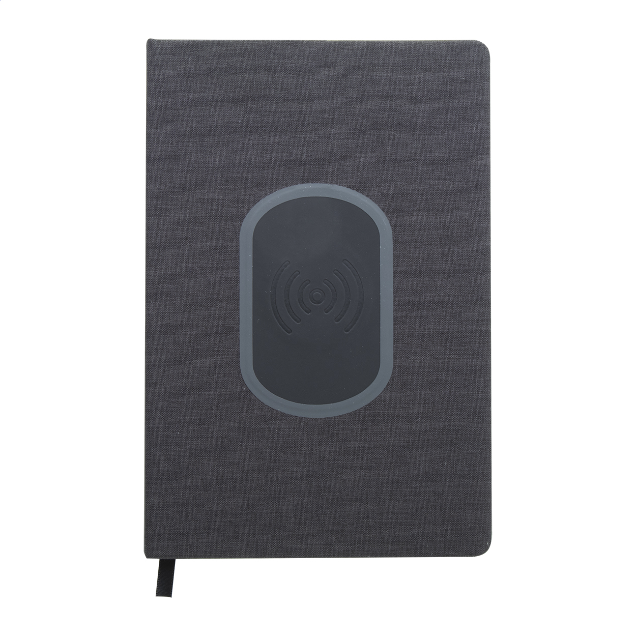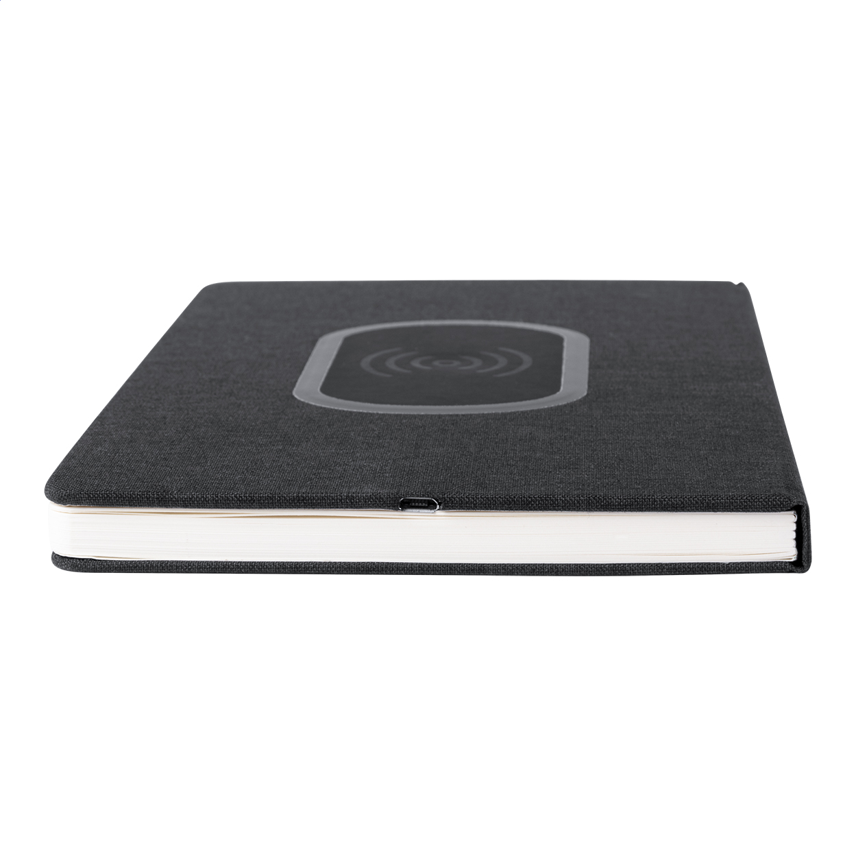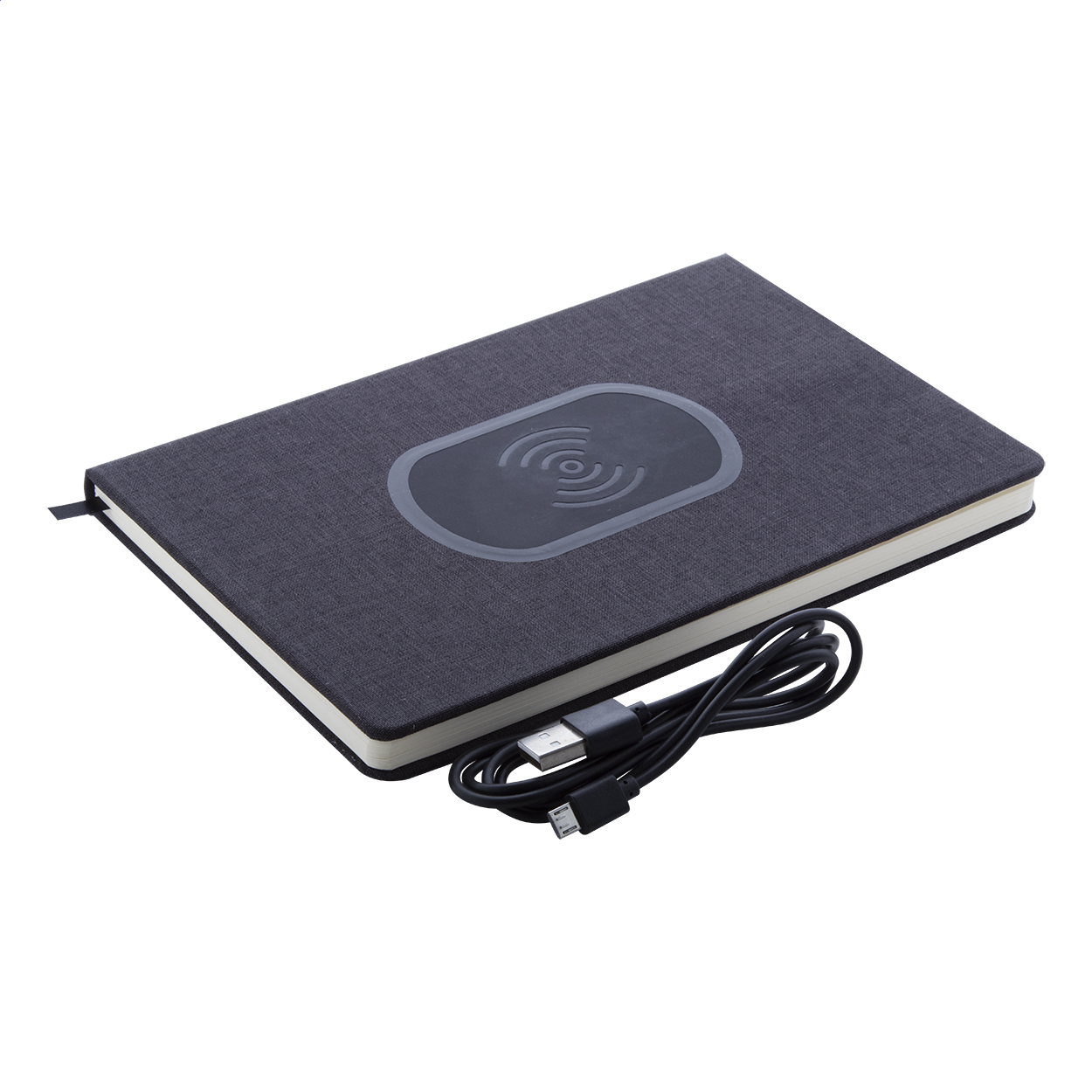Taccuino rivestito in poliestere 300D con caricatore rapido wireless integrato (15W) e 80 fogli foderati. Formato A5. Incluso cavo di ricarica USB.