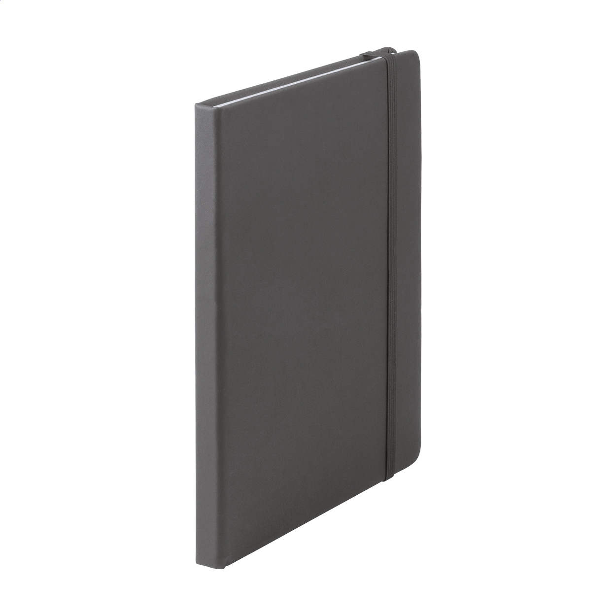 Quaderno con 100 fogli bianchi rivestito in pelle PU, segnalibro e cinturino in gomma coordinati.