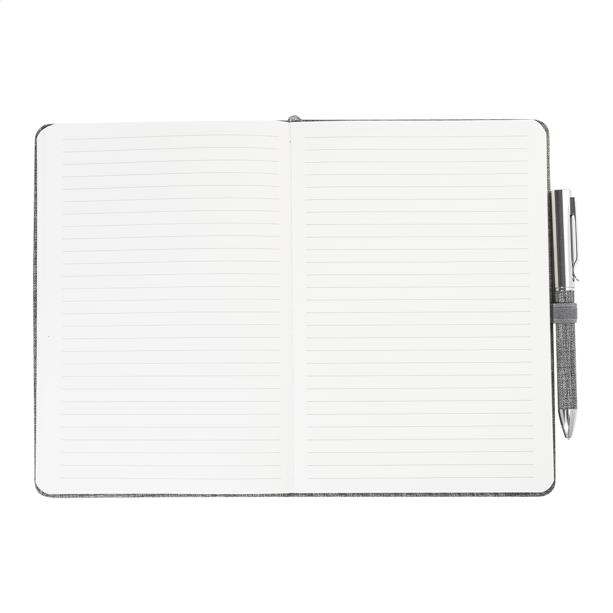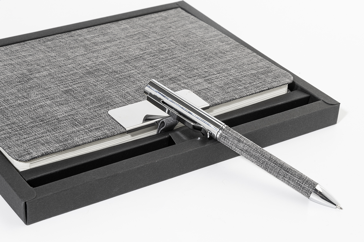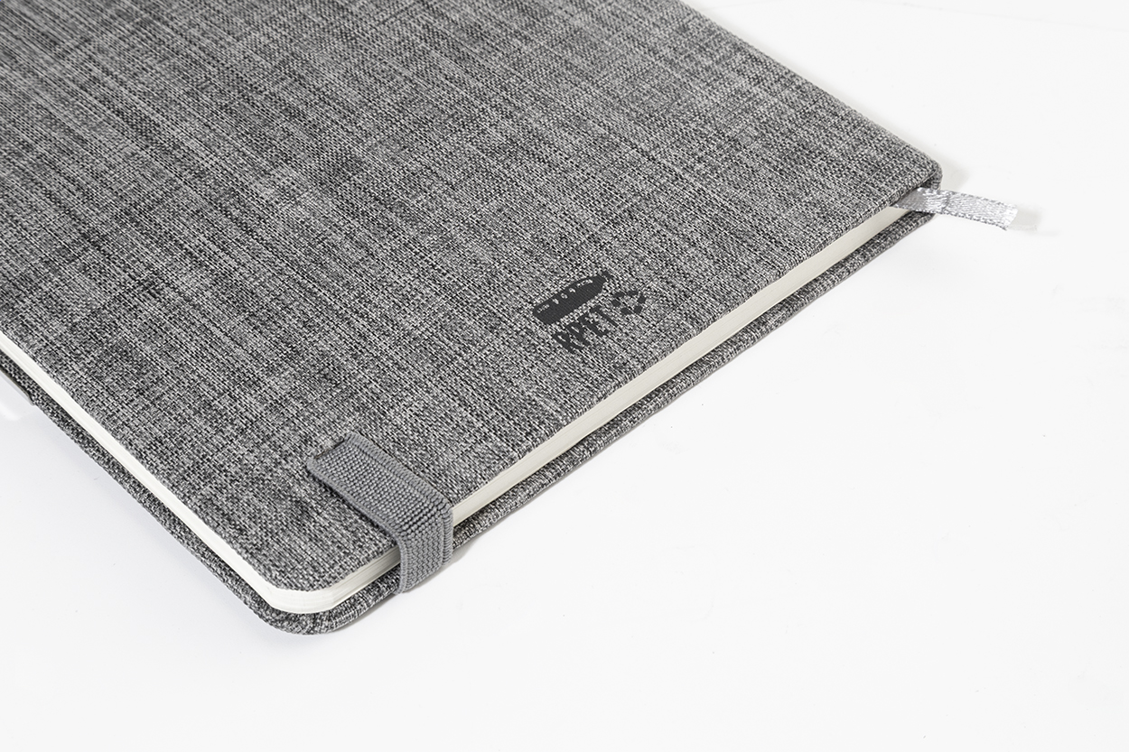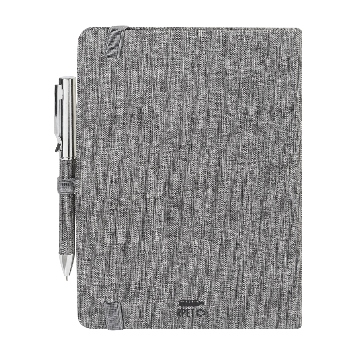 Quaderno formato A5 con copertina in poliestere 300D RPET, 100 fogli a righe, elastico di chiusura in gomma, penna a sfera in metallo con rivestimento in poliestere RPET e refill blu.