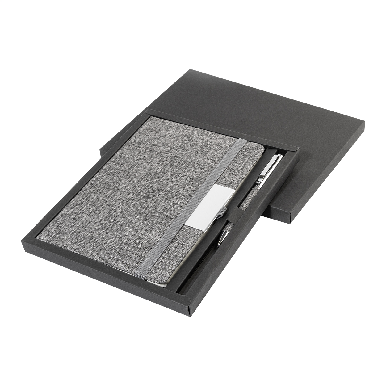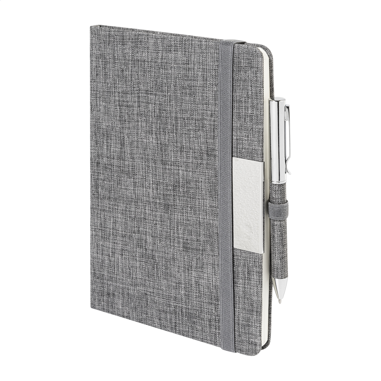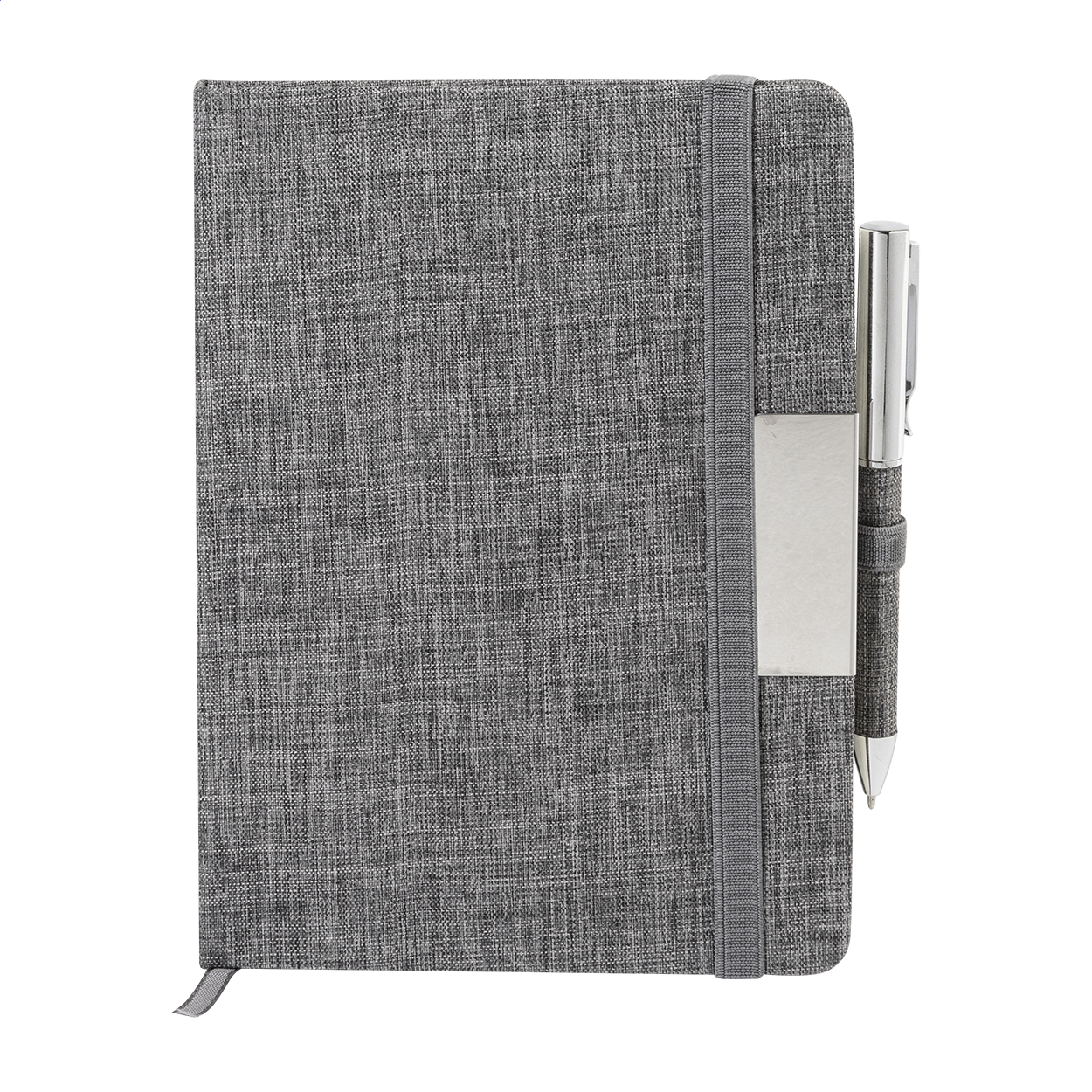 Quaderno formato A5 con copertina in poliestere 300D RPET, 100 fogli a righe, elastico di chiusura in gomma, penna a sfera in metallo con rivestimento in poliestere RPET e refill blu.