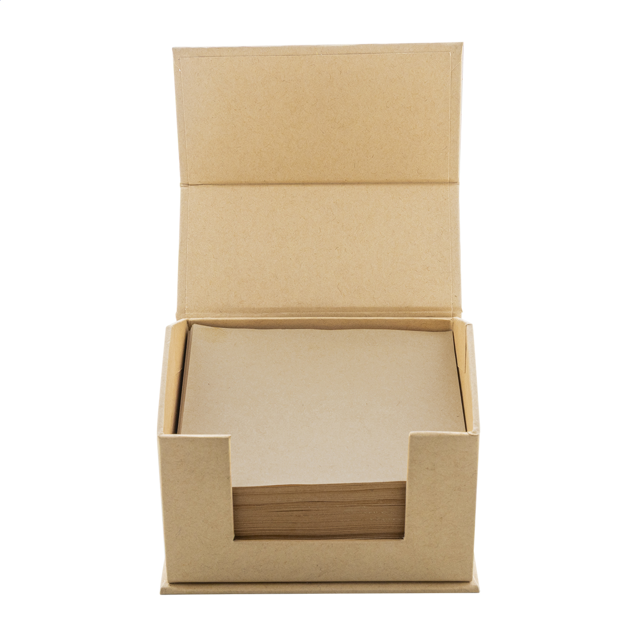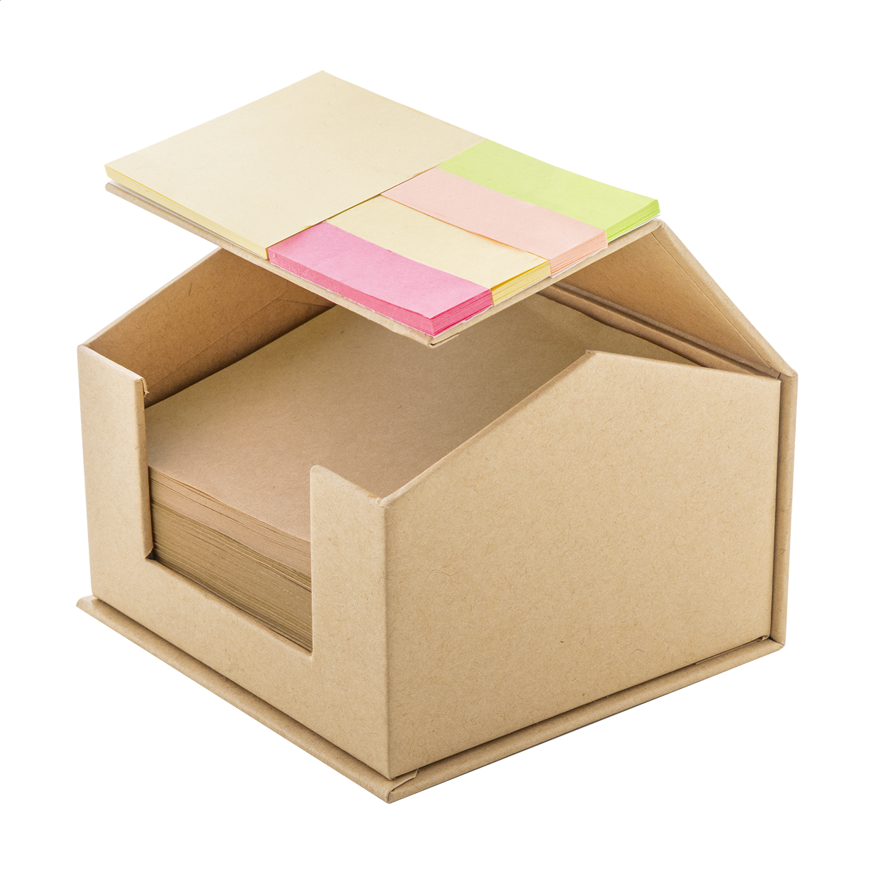 Dispenser in cartoncino riciclato a forma di casa con blocco memo da 300 fogli in carta kraft riciclata, 25 foglietti adesivi gialli e 100 segnapagina (in 4 colori)