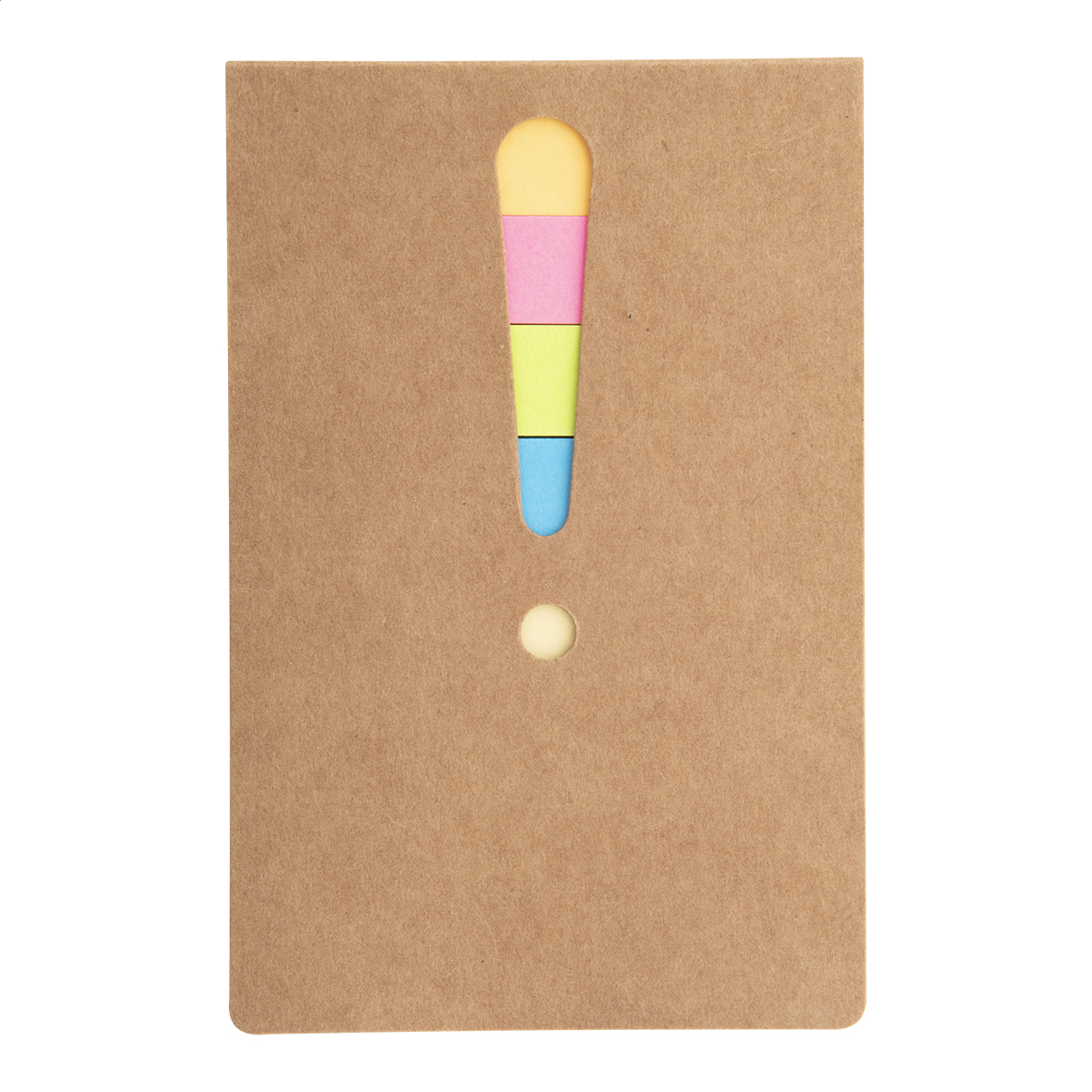 Blocco foglietti adesivi in due formati, 25 foglietti grandi e 100 piccoli (in 4 colori diversi). Con punto esclamativo fustellato sulla copertina.