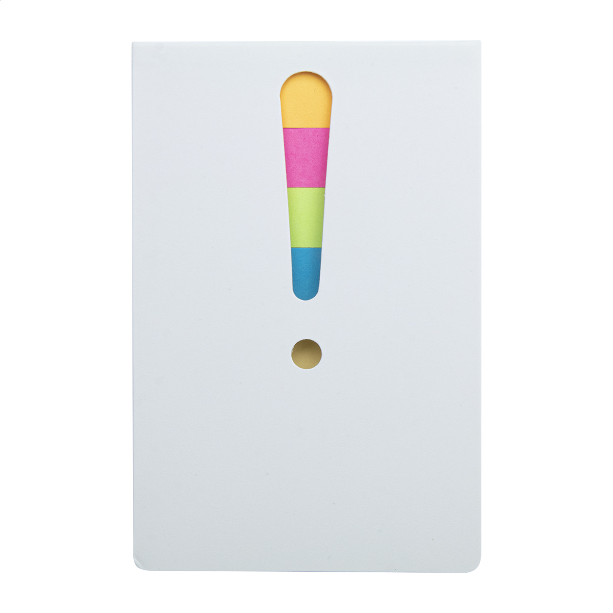 Blocco foglietti adesivi in due formati, 25 foglietti grandi e 100 piccoli (in 4 colori diversi). Con punto esclamativo fustellato sulla copertina.
