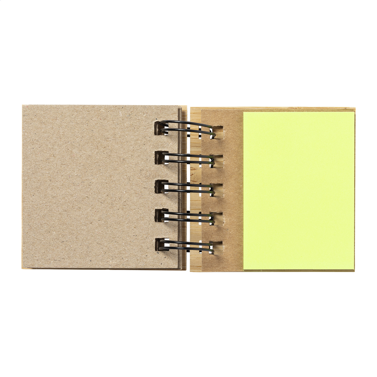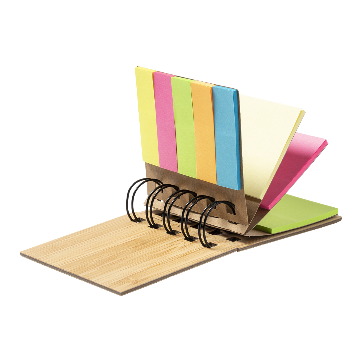Quaderno a spirale con copertina in bambù, con 75 fogli adesivi grandi (in 3 colori diversi) e 125 piccoli (in 5 colori diversi).