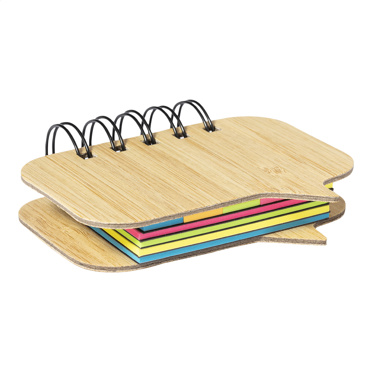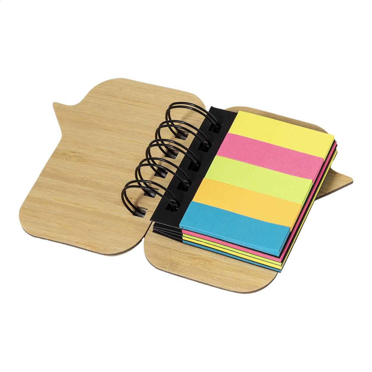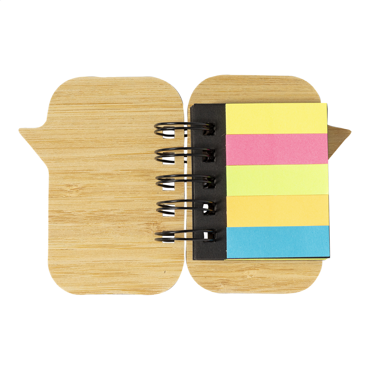 Blocco a spirale con copertina in bambù, contenente 100 foglietti adesivi di grandi dimensioni (in 4 colori diversi) e 125 segnapagina (in 5 colori diversi).