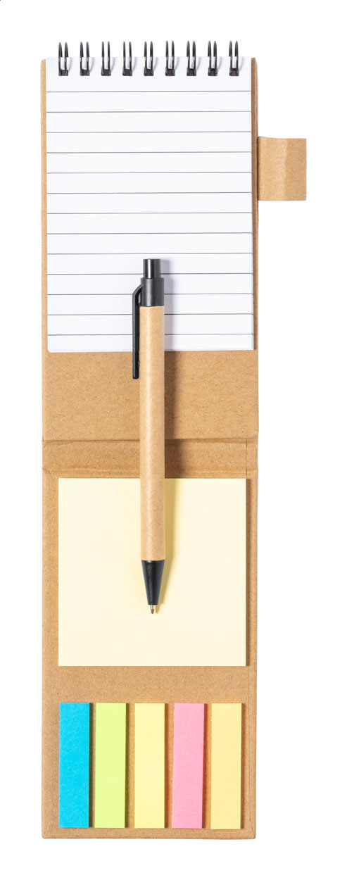 Blocchetto note a spirale con copertina in carta riciclata, 30 fogli a righe, 25 foglietti adesivi, 125 segnapagina (in 5 colori diversi). Con funzione portacellulare. Inclusa penna a sfera in carta riciclata con refill blu.