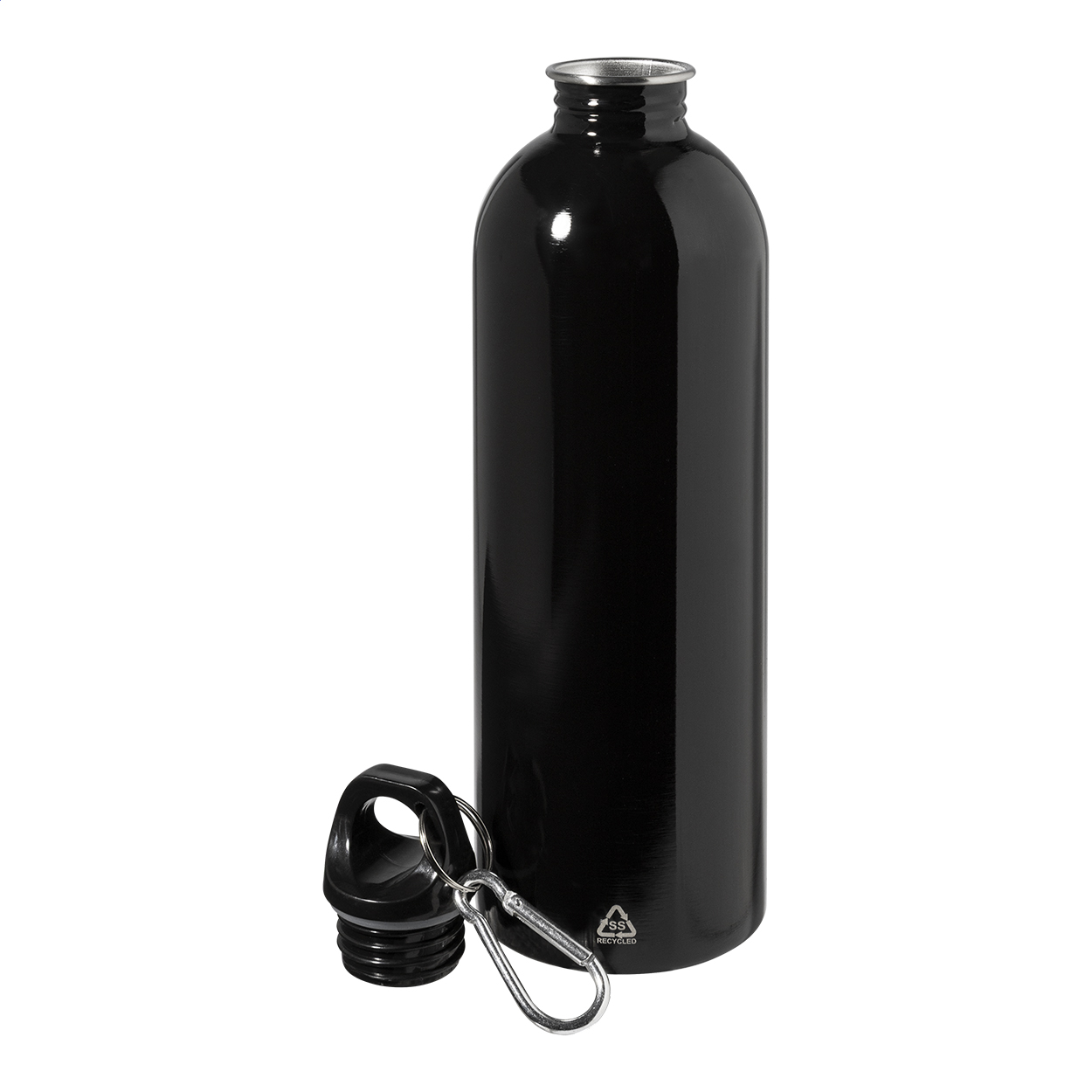 Borraccia in acciaio riciclato con capacità di 750ml e moschettone in alluminio.