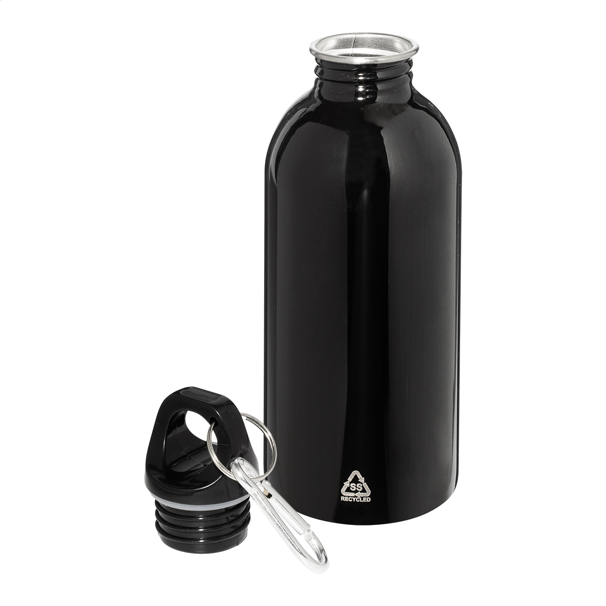 Borraccia in acciaio riciclato con capacità di 400ml e moschettone in alluminio.
