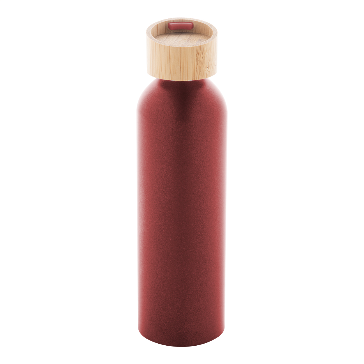 Borraccia da 600ml. in alluminio riciclato con coperchio in bambù e tracolla in silicone di colore coordinato.
