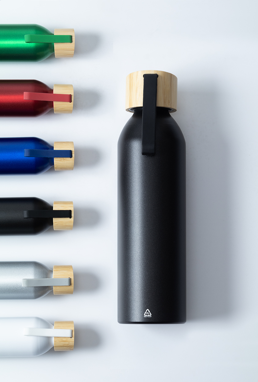 Borraccia da 600ml. in alluminio riciclato con coperchio in bambù e tracolla in silicone di colore coordinato.