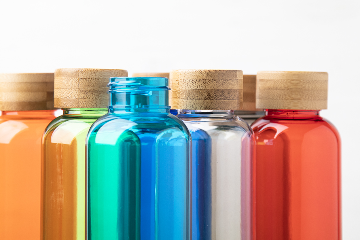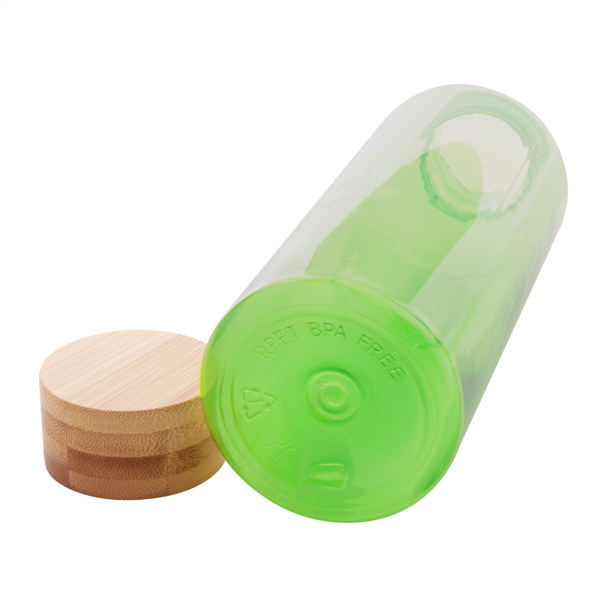 Borraccia da 500ml. in RPET non contenente BPA con tappo in bambù. Non adatta per l'utilizzo con bevande gassate.