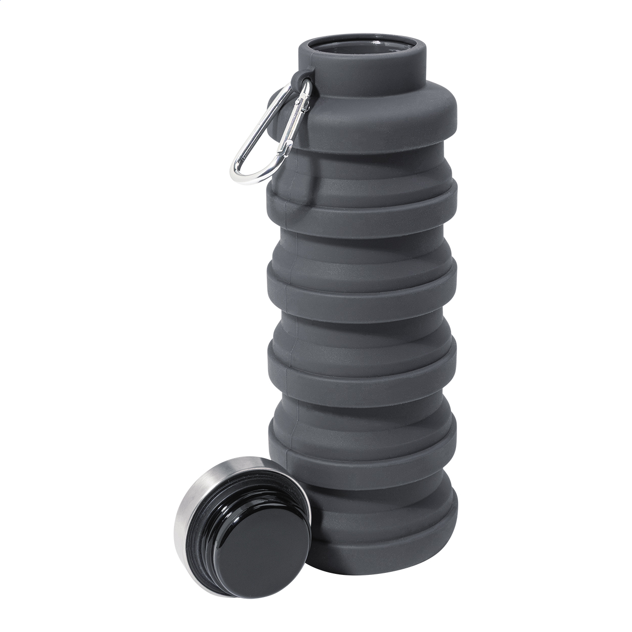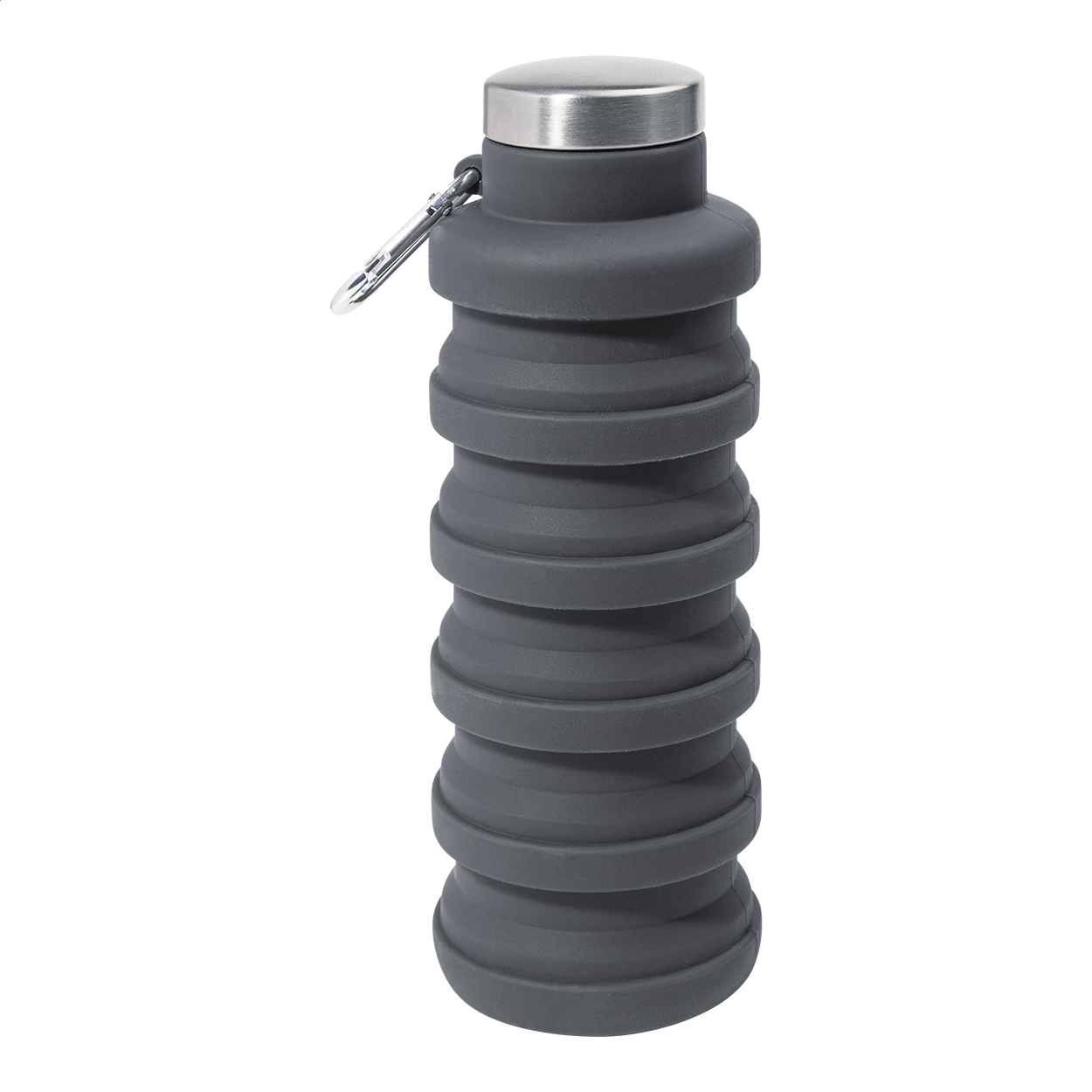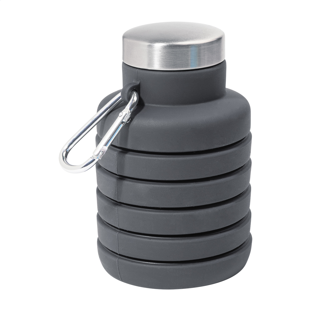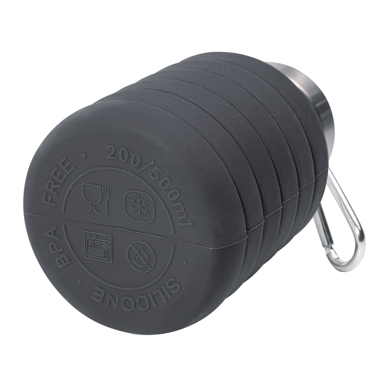 Borraccia comprimibile da 500 ml in silicone con tappo in acciaio inox e moschettone in alluminio.