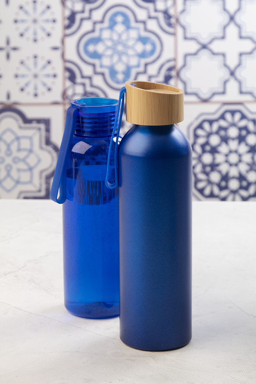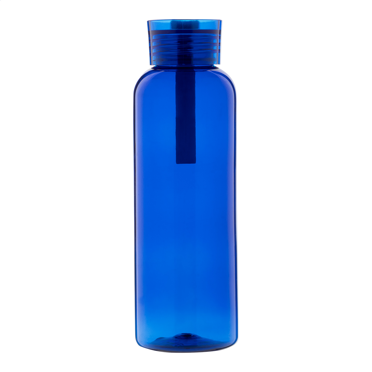 Borraccia da 500 ml. in RPET con coperchio in colore coordinato e cinghia in silicone. Non adatta per l'utilizzo con bevande gassate.