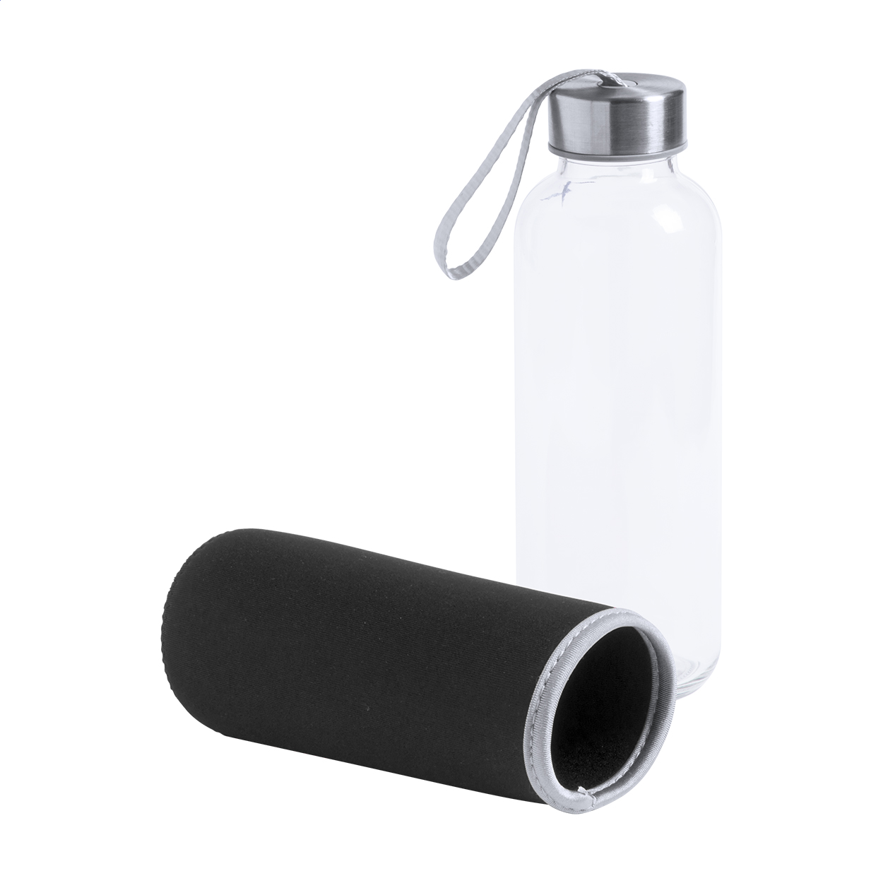 Borraccia da 420ml. in vetro con rivestimento in neoprene colorato. Non adatta per l'utilizzo con bevande gassate.
