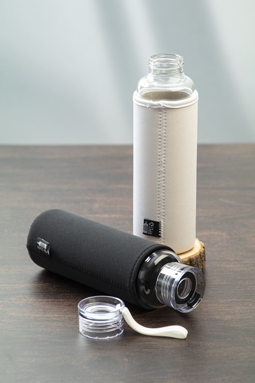 Borraccia in vetro riciclato da 550ml. con coperchio in plastica PS, cinturino in silicone e coperchio in neoprene RPET. Non adatta per l'utilizzo con bevande gassate.