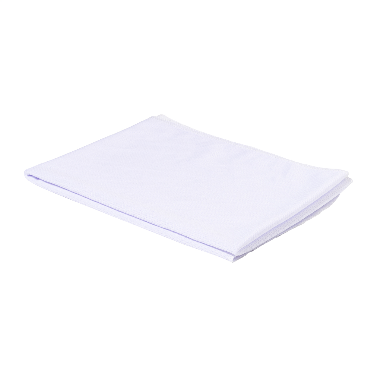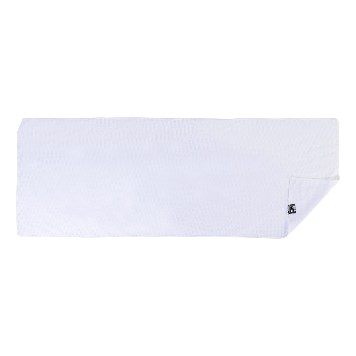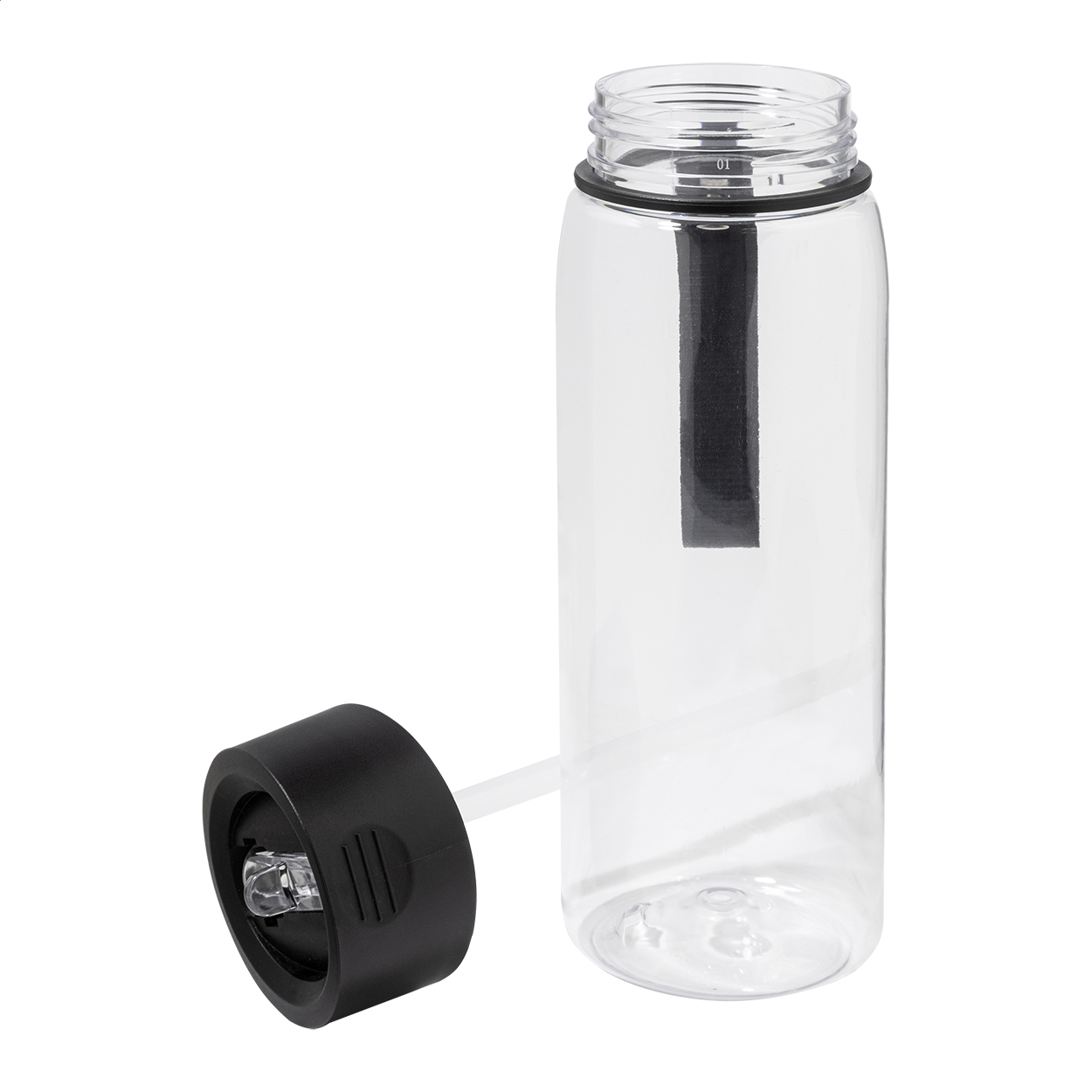 Asciugamano sportivo 30x80cm in poliestere RPET con borraccia in RPET da 800ml., senza BPA, tappo flip-top in PP, cannuccia integrata e tracolla. La borraccia non è idonea a contenere bevande gassate.