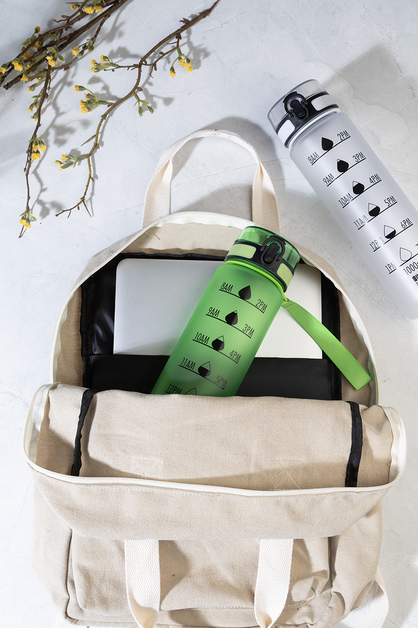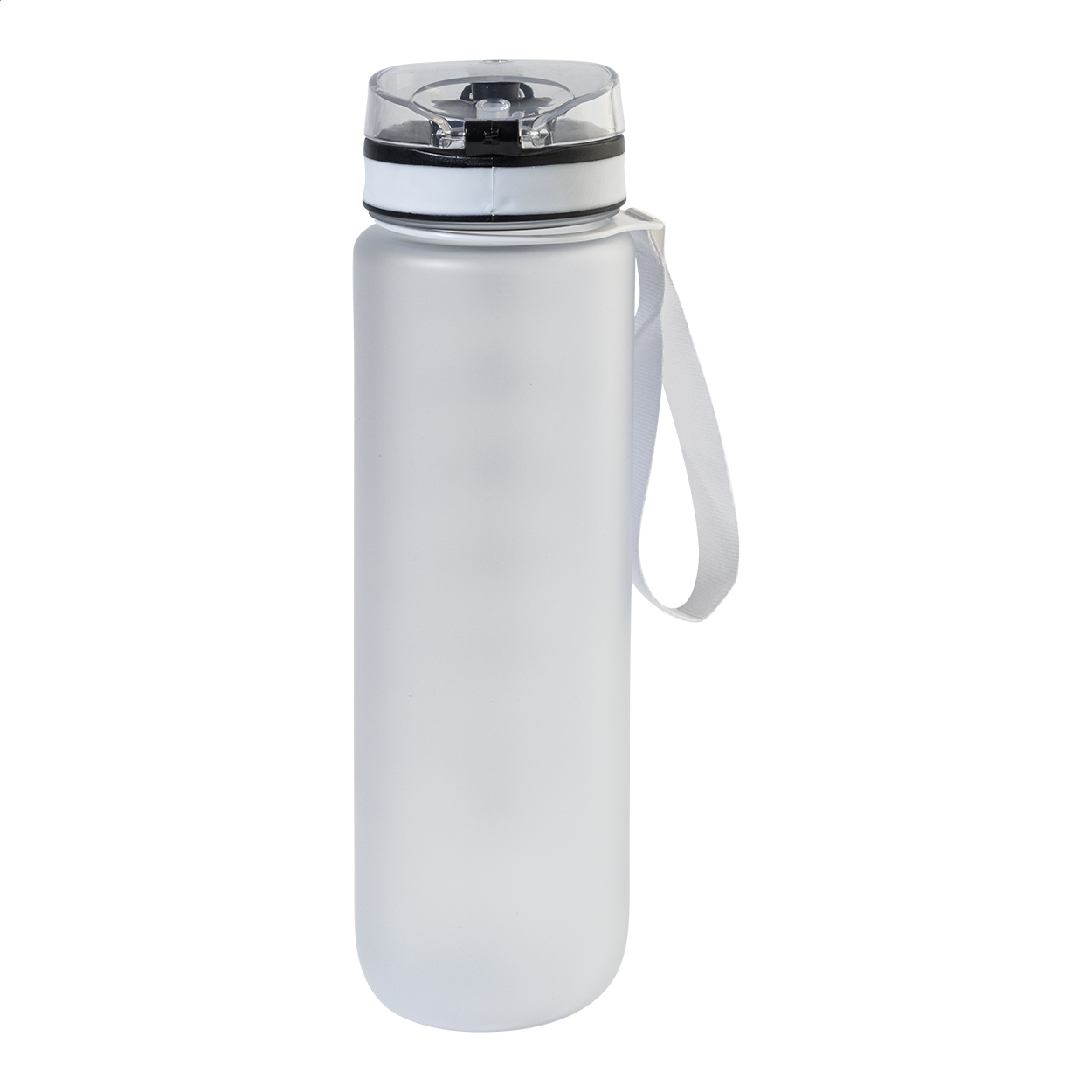 Borraccia in RPET satinato, senza BPA, da 1000ml. con indicazioni motivazionali relative alla quantità d'acqua ed all'orario in cui assumerla, dotata di tappo flip-top ad apertura automatica con chiusura di sicurezza e tracolla. Non adatta a contenere bevande gassate.
