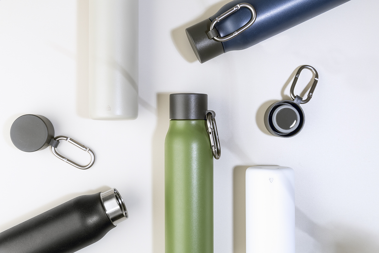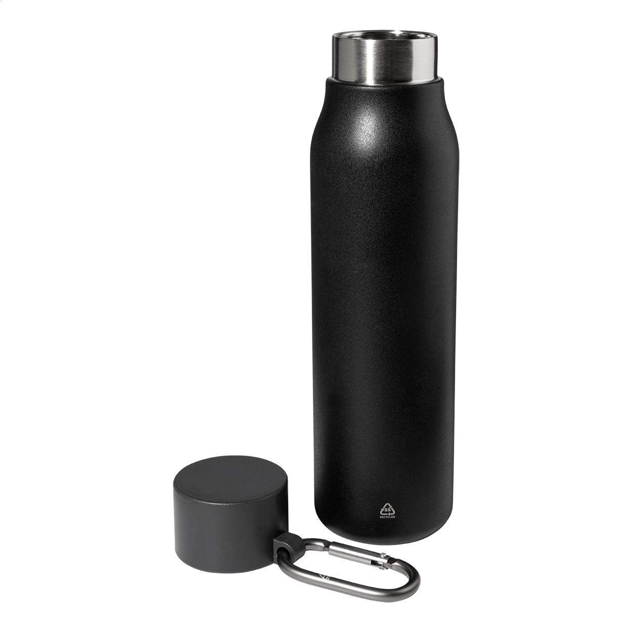 Borraccia termica in acciaio riciclato a doppia parete da 500ml. Con tappo in PP e moschettone in alluminio riciclato.
