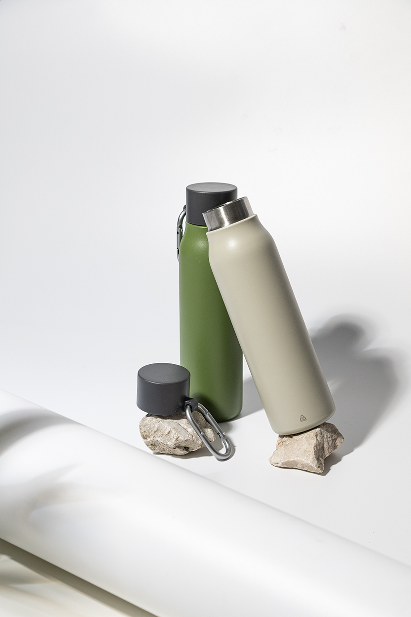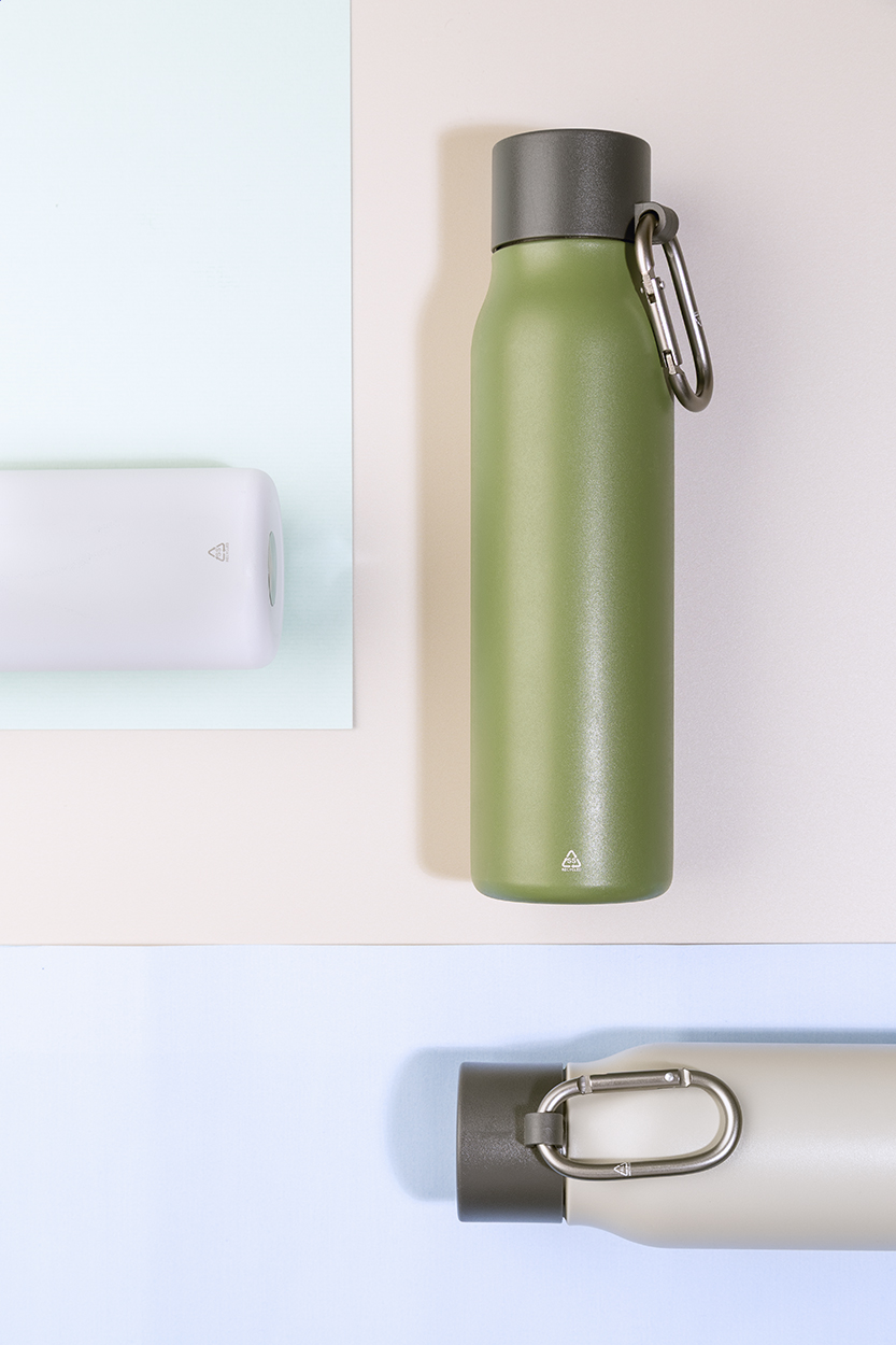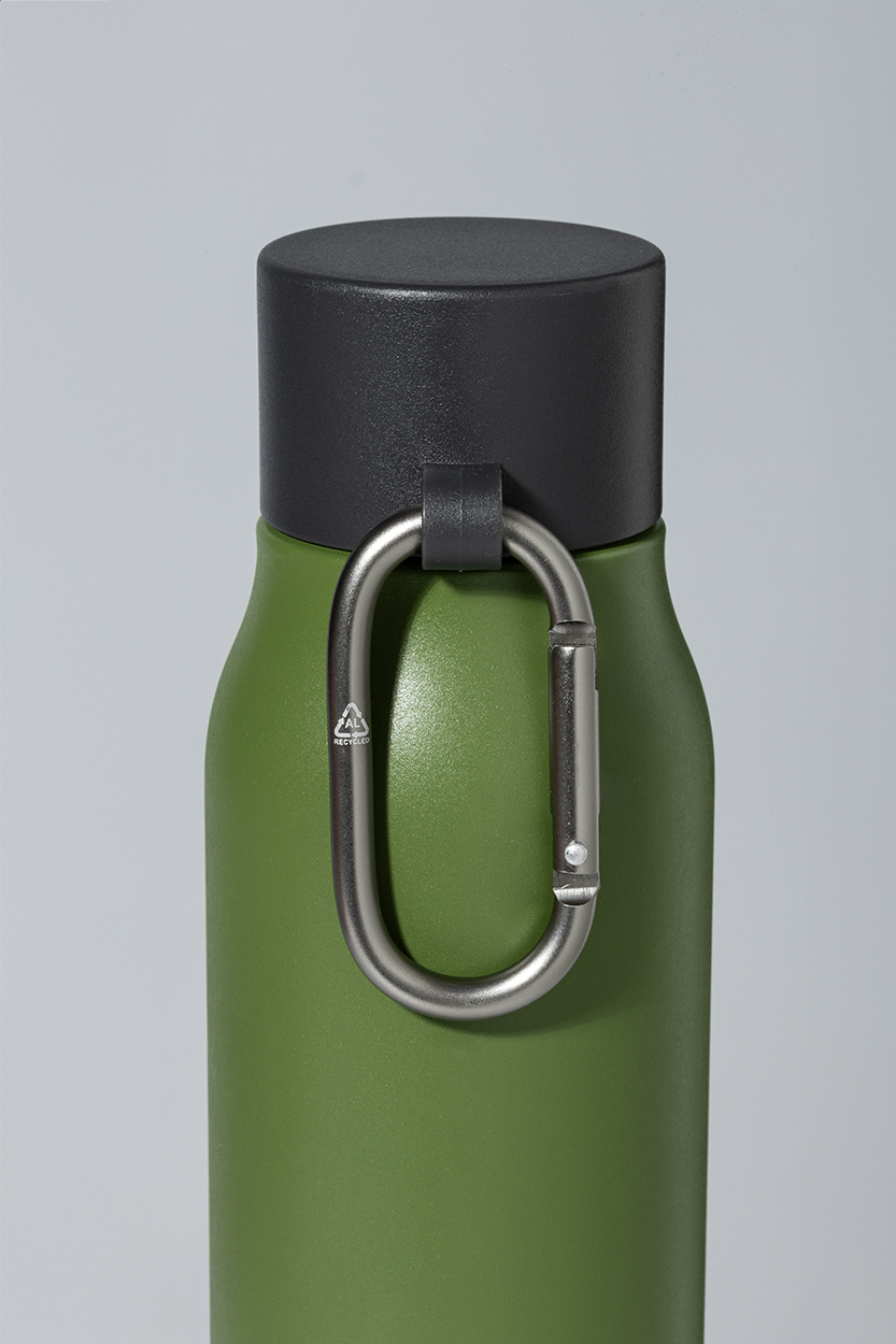 Borraccia termica in acciaio riciclato a doppia parete da 500ml. Con tappo in PP e moschettone in alluminio riciclato.