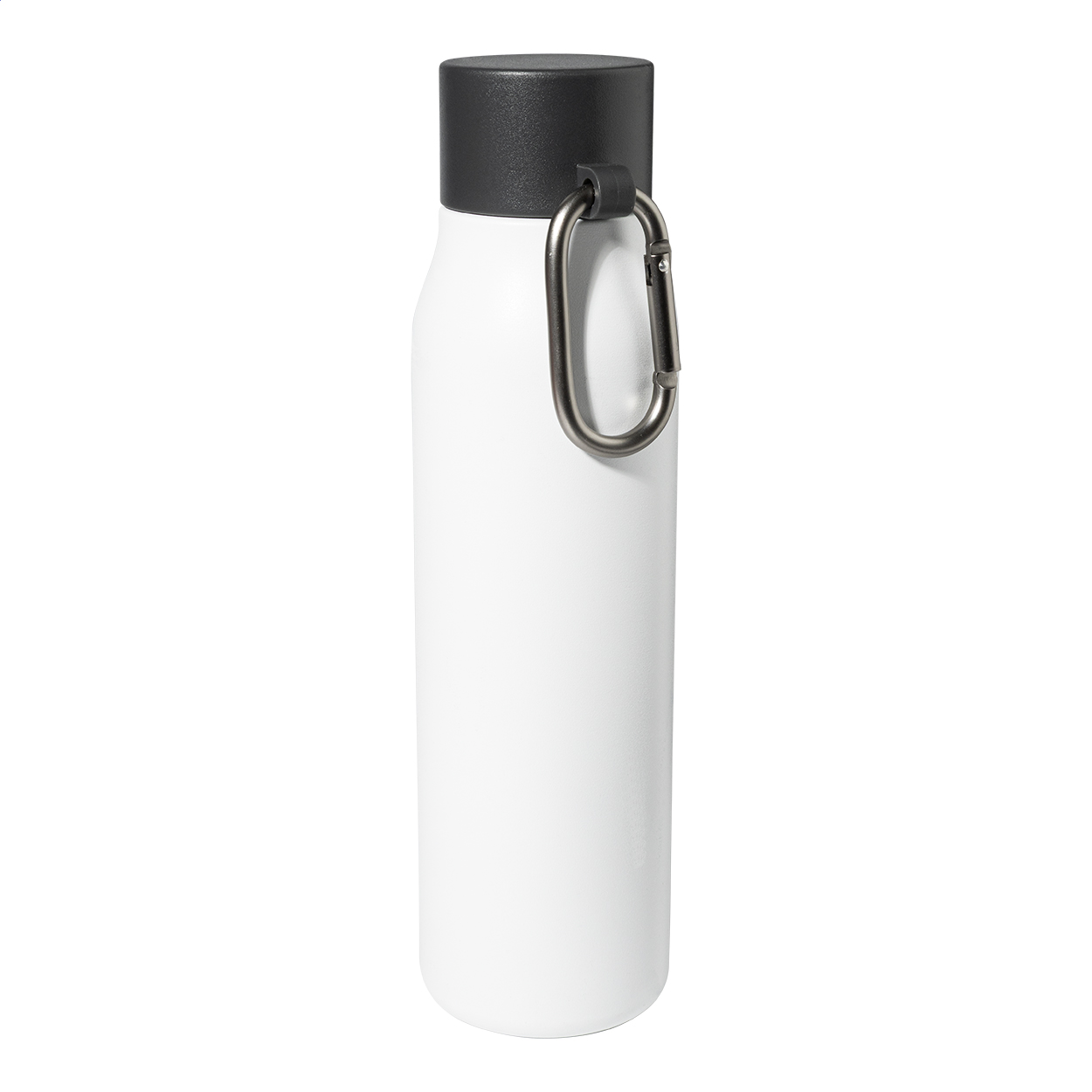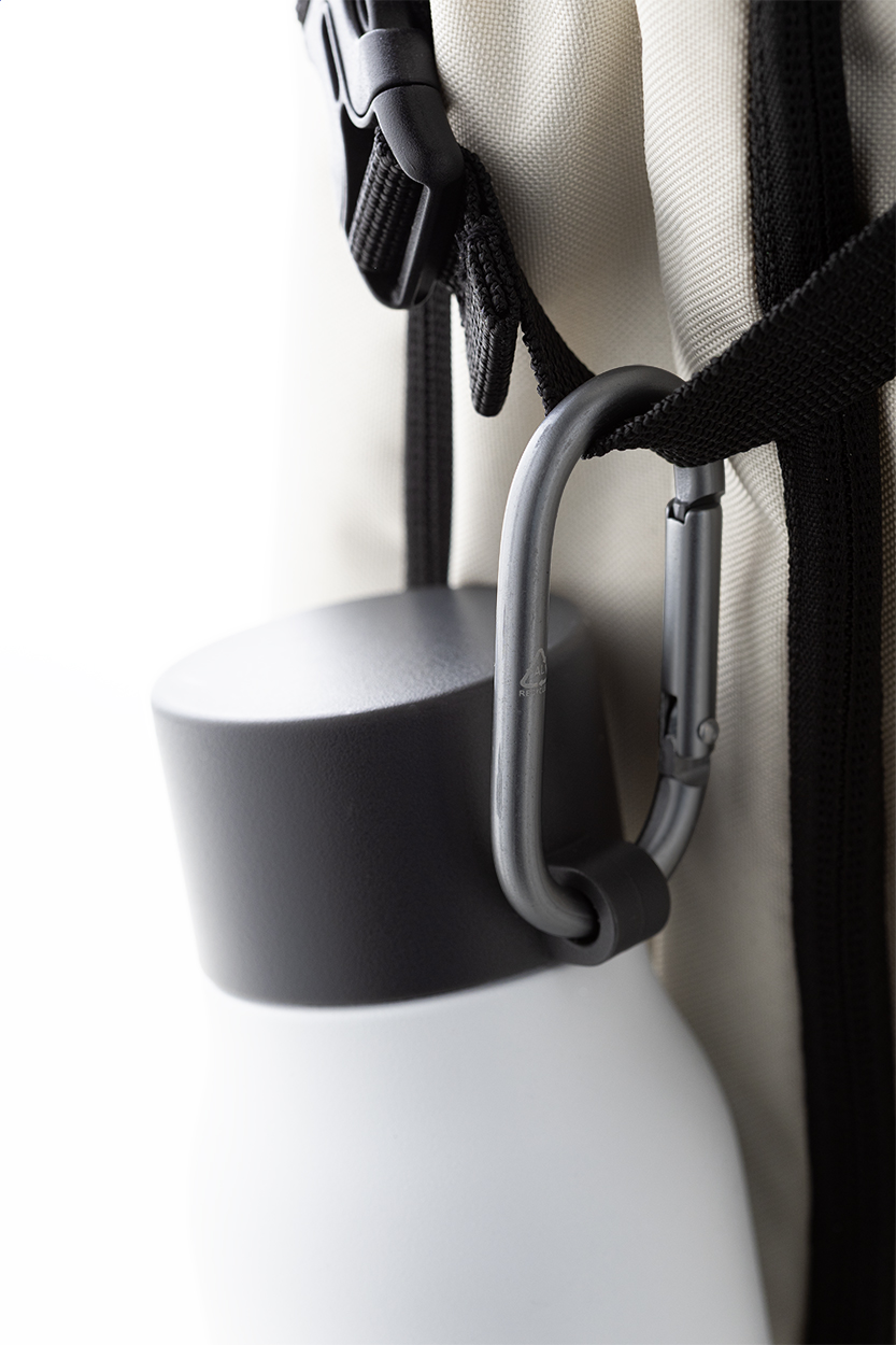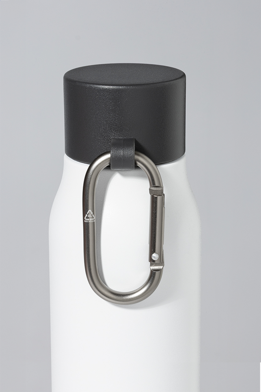 Borraccia termica in acciaio riciclato a doppia parete da 500ml. Con tappo in PP e moschettone in alluminio riciclato.
