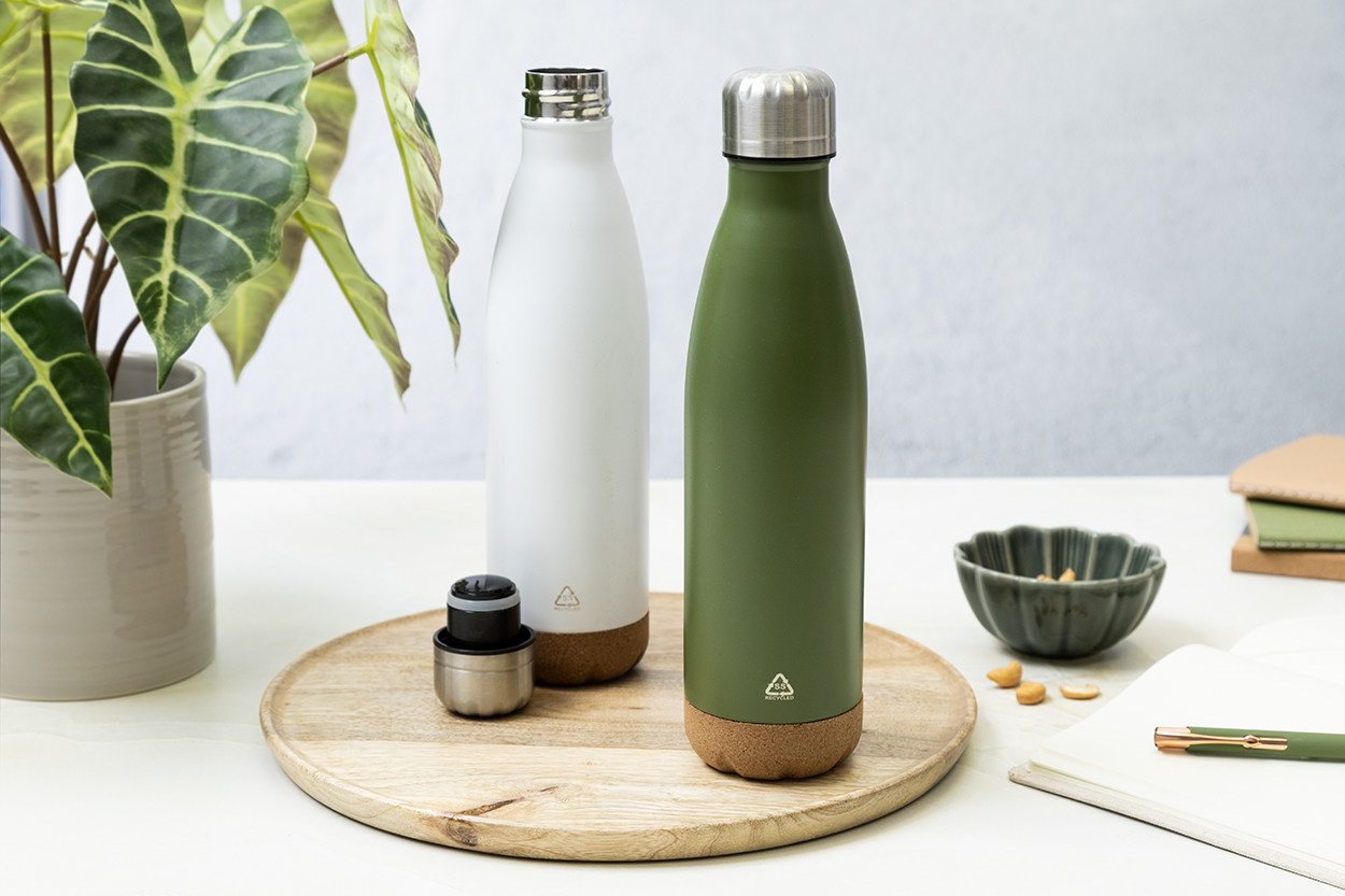Borraccia da 500ml in acciaio inox a doppia parete con struttura termica sottovuoto e base in sughero naturale