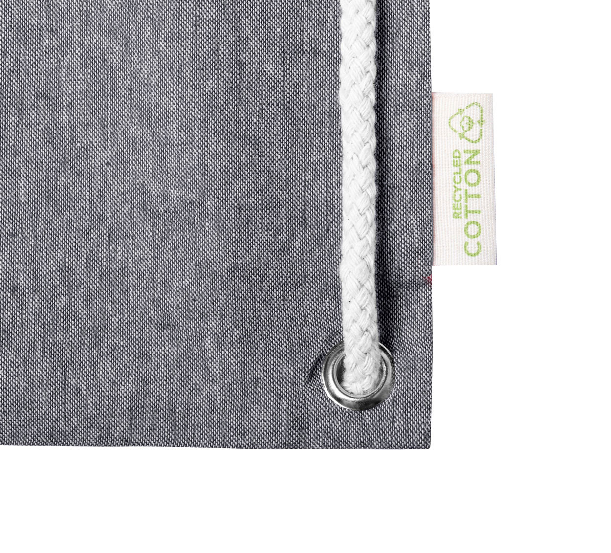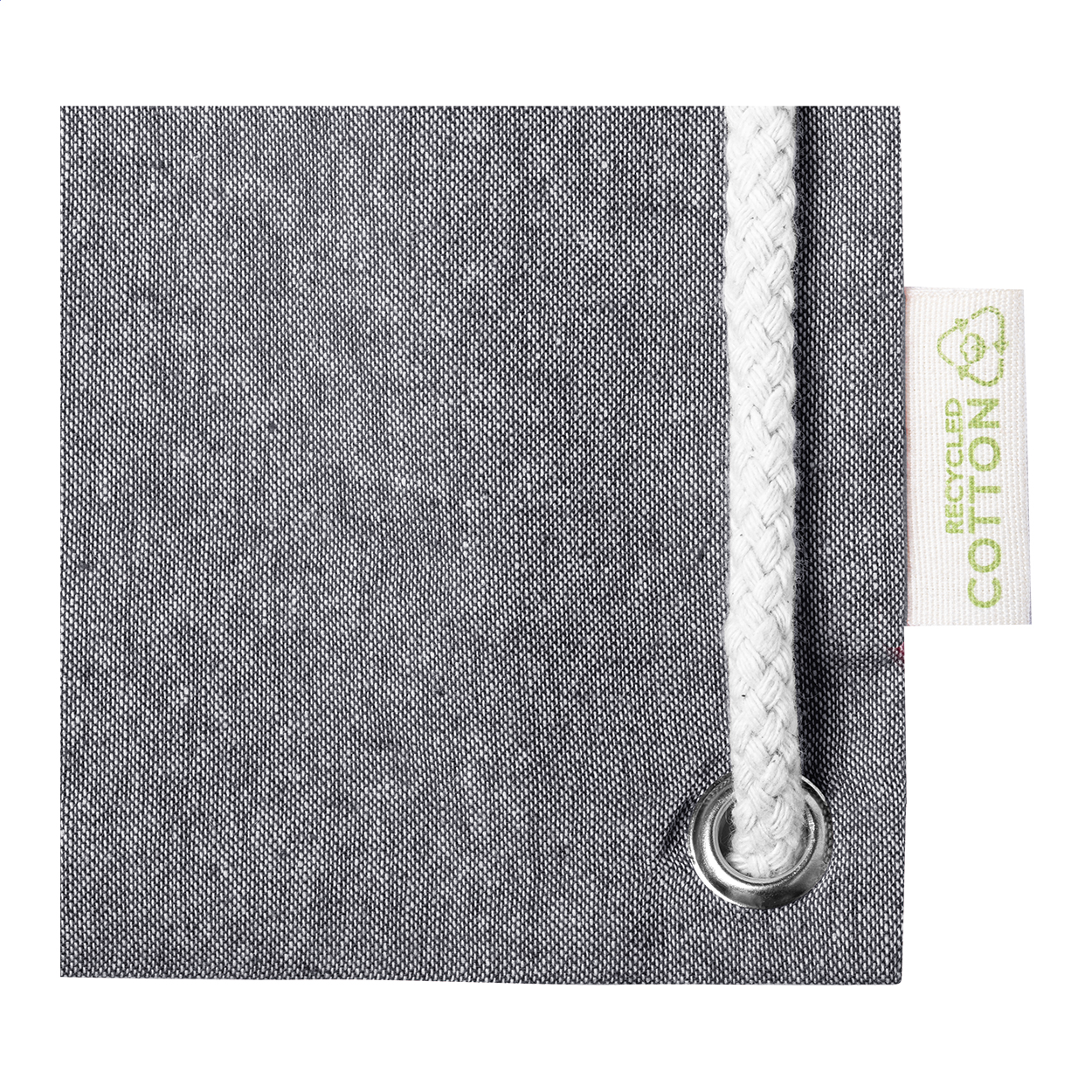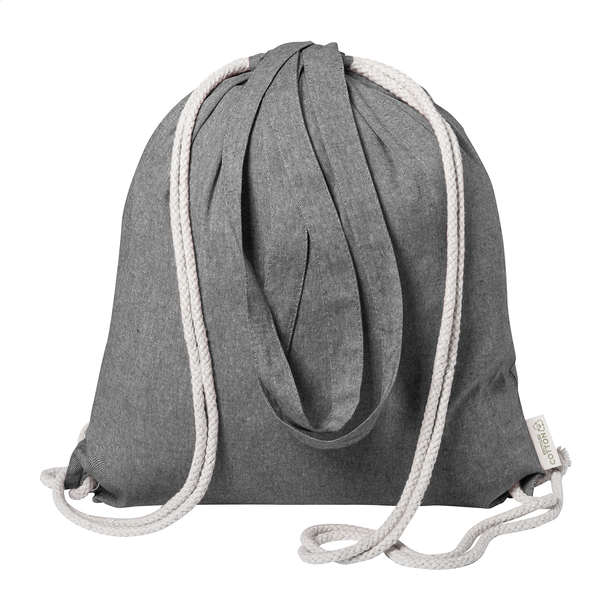 Sacca shopper con chiusura a coulisse in cotone riciclato e lunghi cordoncini intrecciati e spessi. Può essere utilizzata anche come borsa per la spesa. 100% cotone riciclato, 140 g/m².