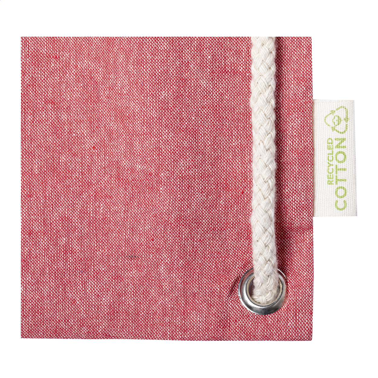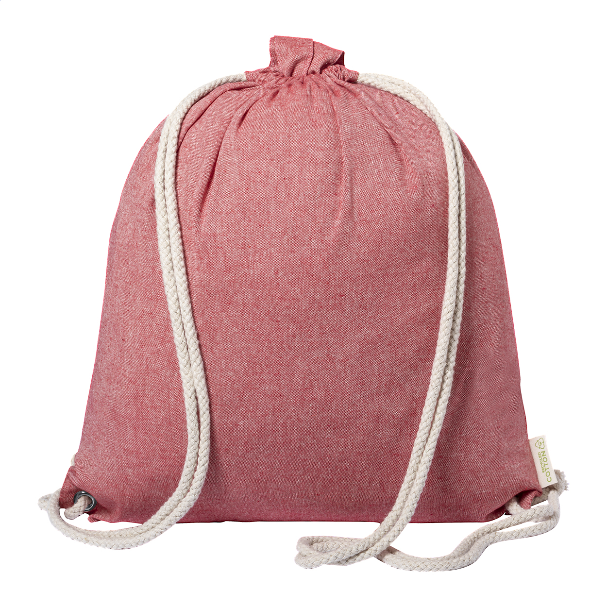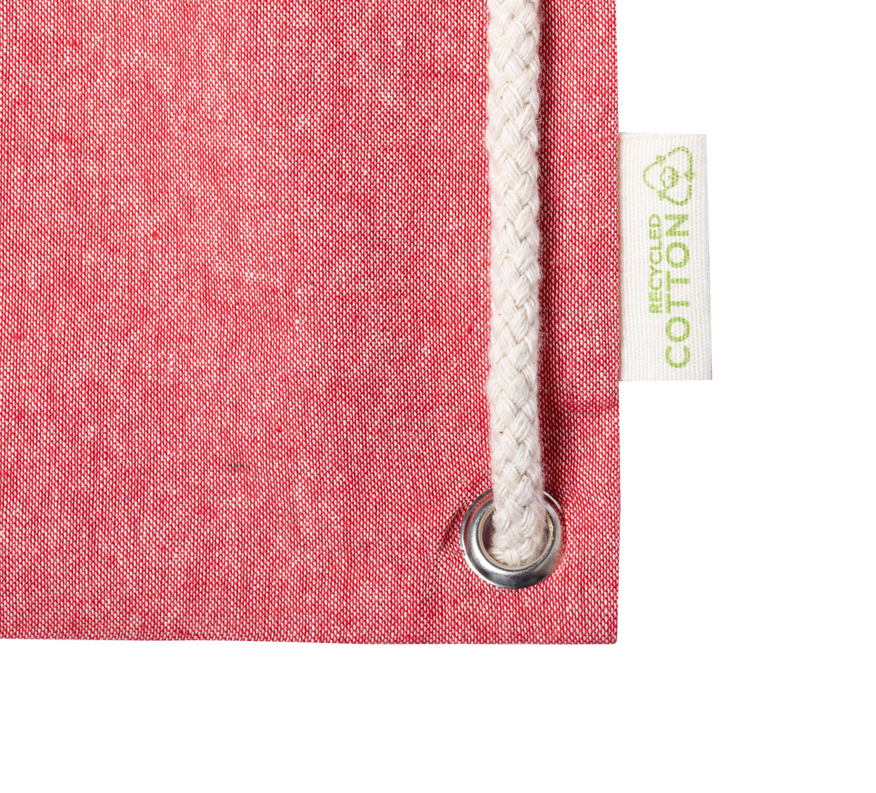 Sacca shopper con chiusura a coulisse in cotone riciclato e lunghi cordoncini intrecciati e spessi. Può essere utilizzata anche come borsa per la spesa. 100% cotone riciclato, 140 g/m².