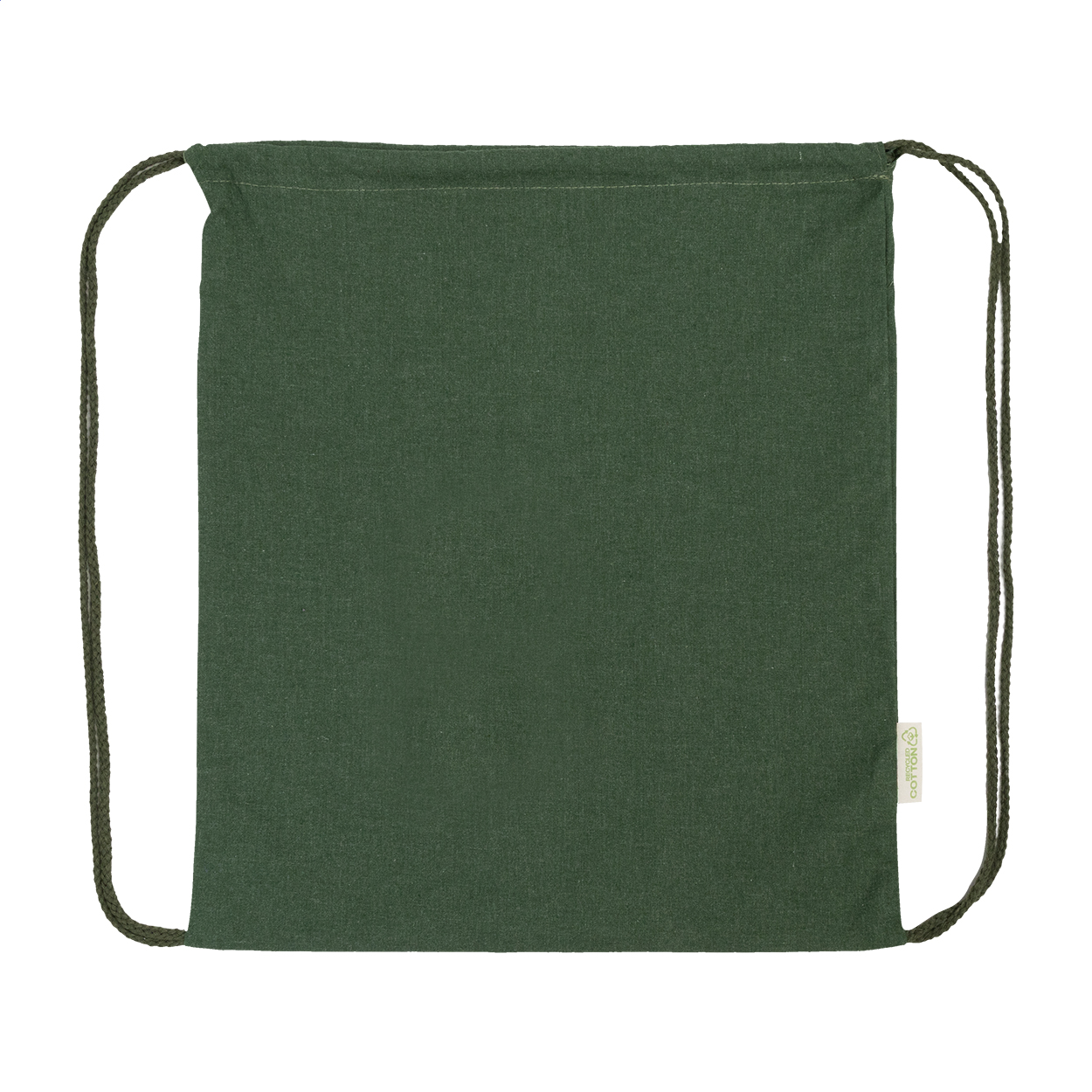 Sacca con chiusura a coulisse in 70% cotone riciclato e 30% poliestere RPET, 140 g/m² ed etichetta cotone riciclato.