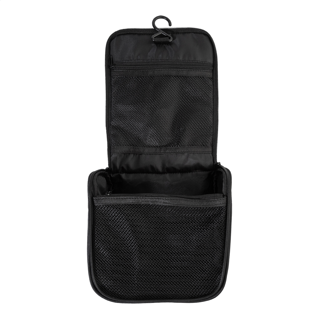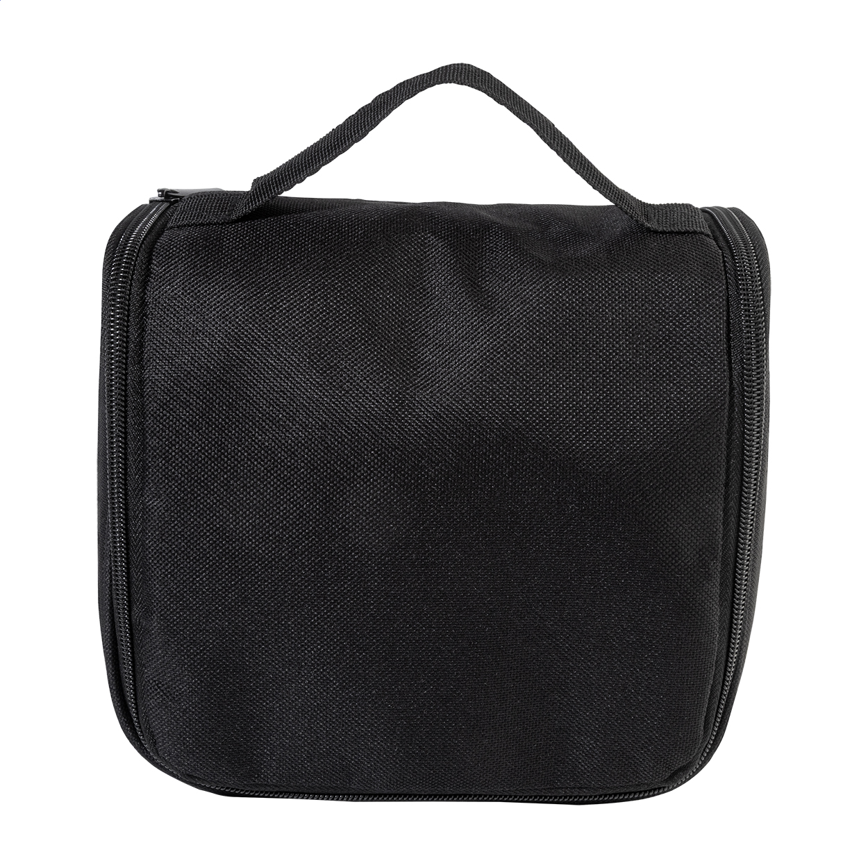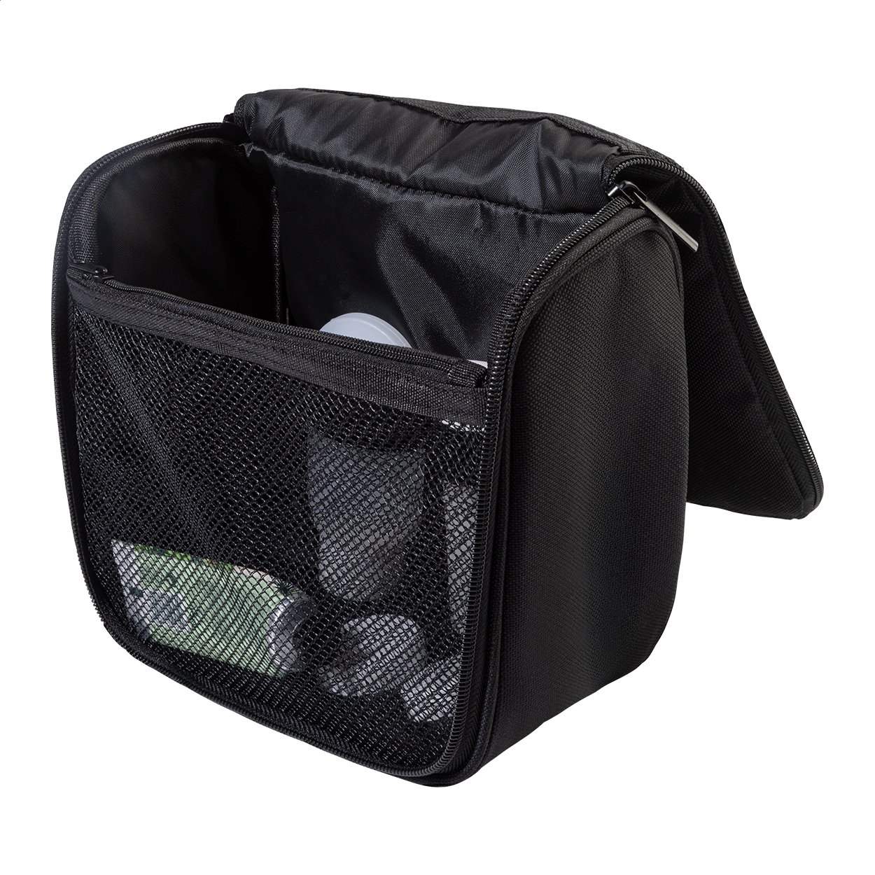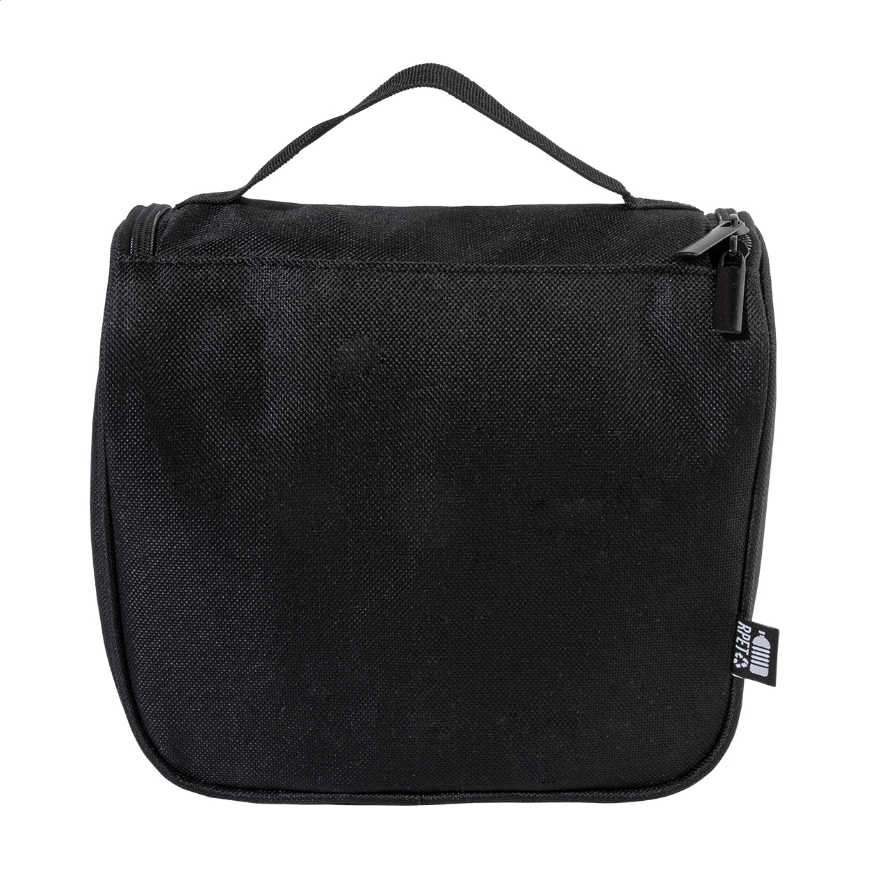 Beauty per cosmetici in poliestere 600D RPET con scomparti interni chiusi con zip, tasche in rete ed etichetta RPET.