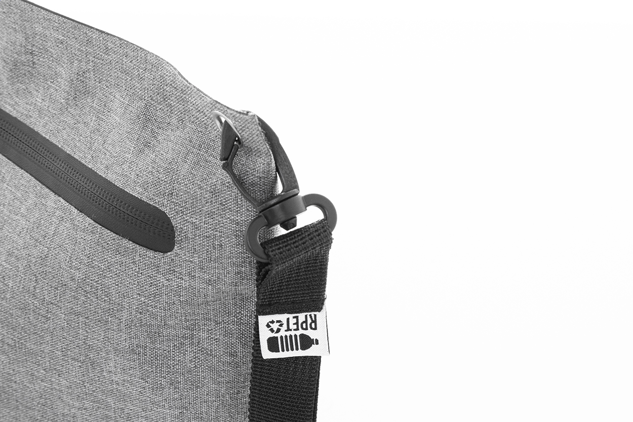 Trousse impermeabile in poliestere 300D RPET per cosmetici, con cerniera, cinturino con moschettone ed etichetta RPET.