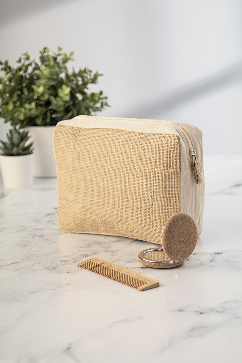Trousse per cosmetici in cotone e juta laminata, con cerniera.