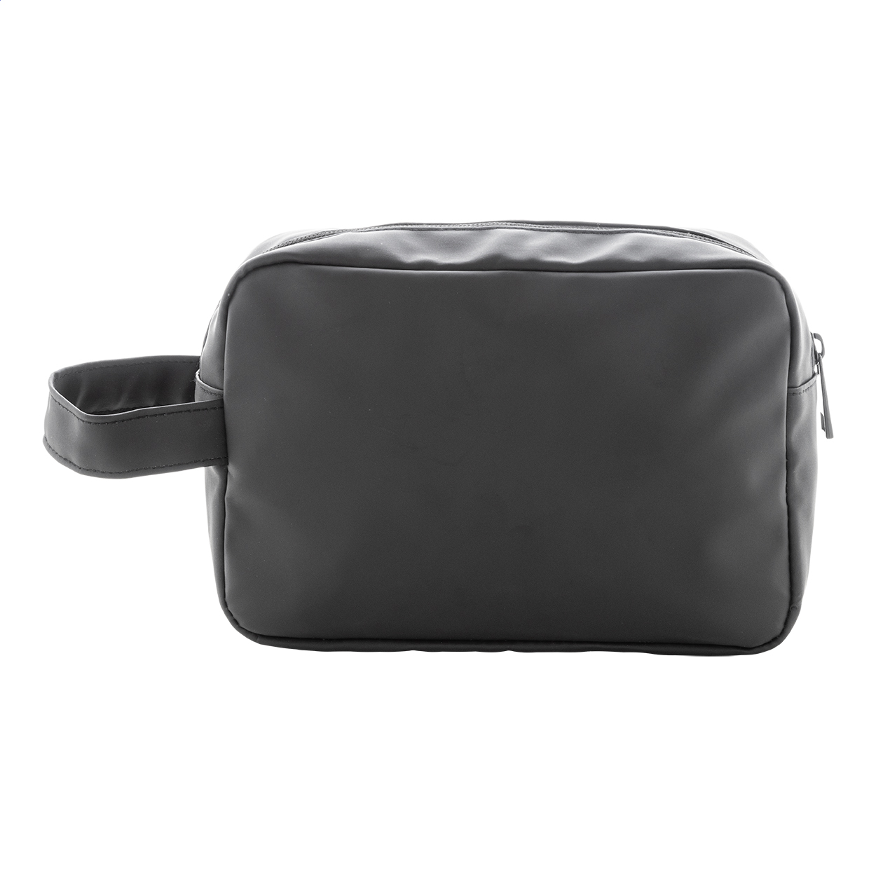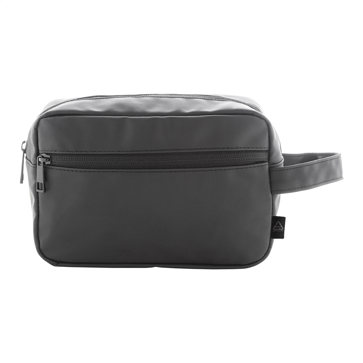 Trousse per cosmetici in morbida pelle PU riciclata, con due scomparti chiusi da cerniera, maniglia ed etichetta PU riciclato.
