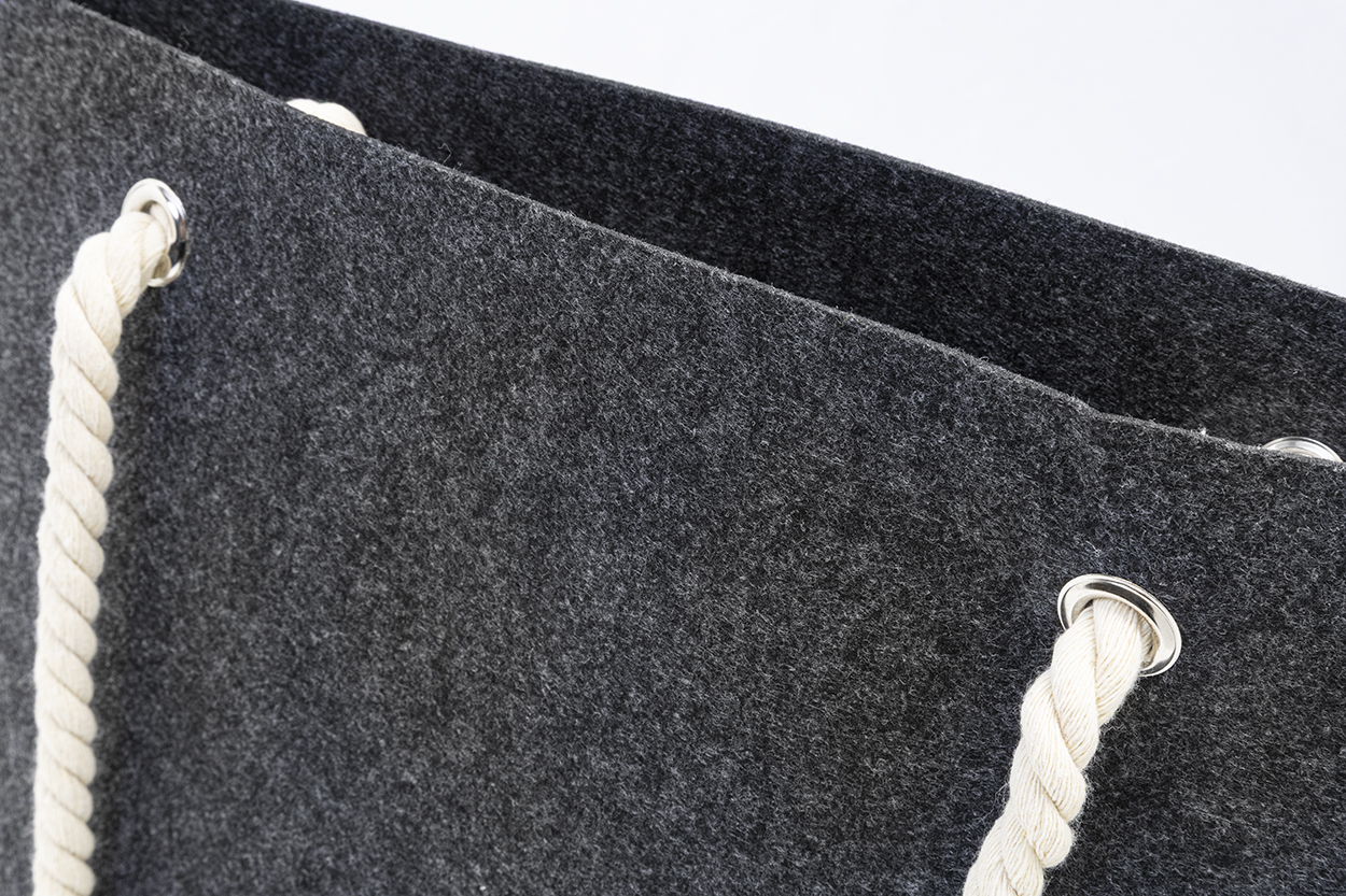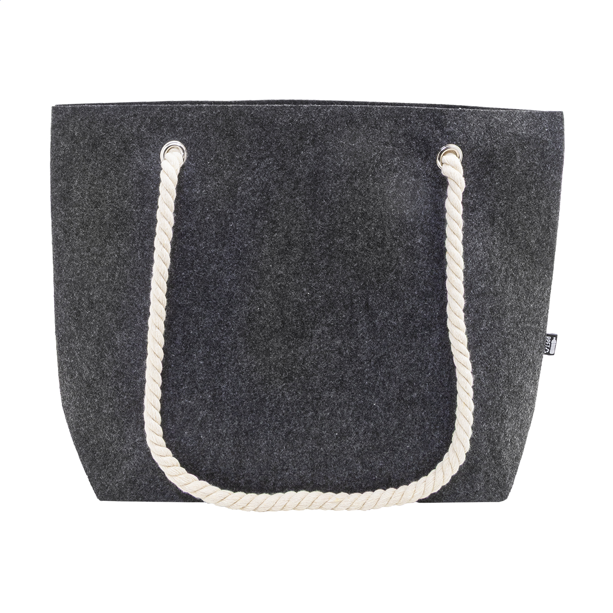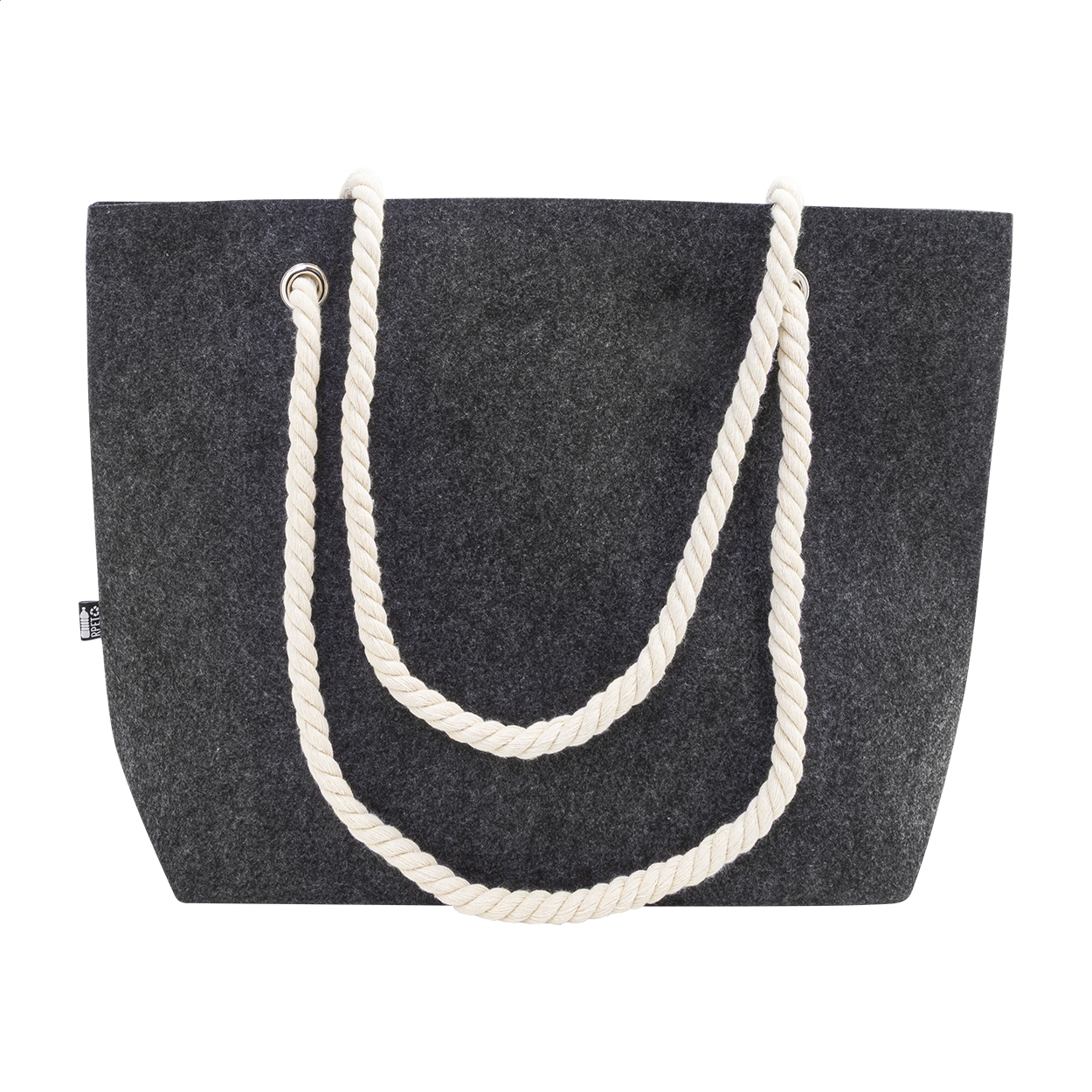 Borsa da spiaggia o per la spesa in feltro RPET con manici in corda di cotone, soffietto sul fondoed etichetta RPET.