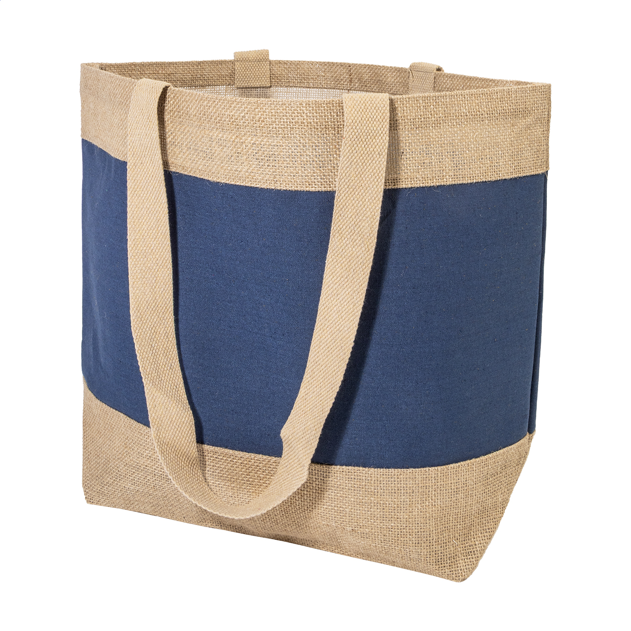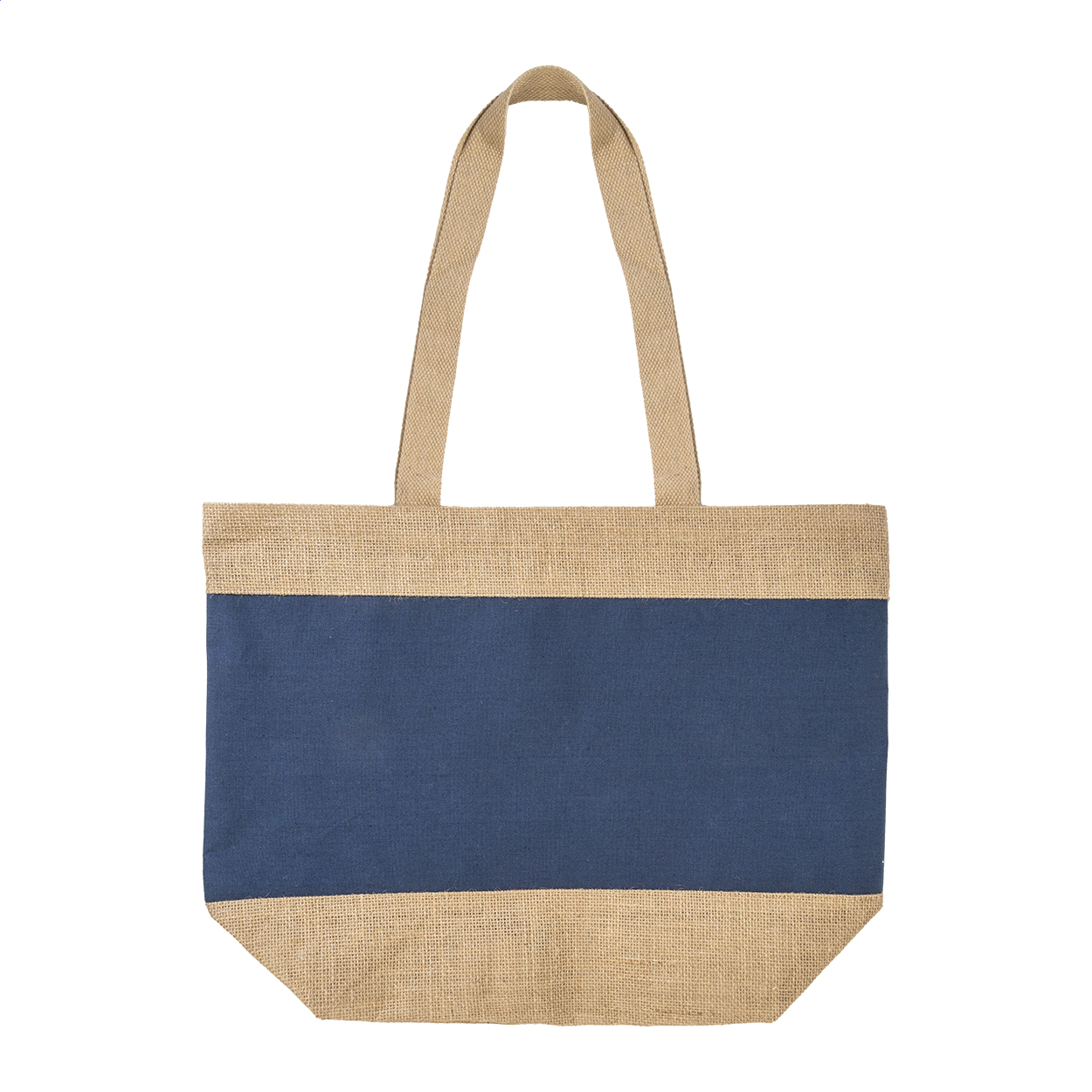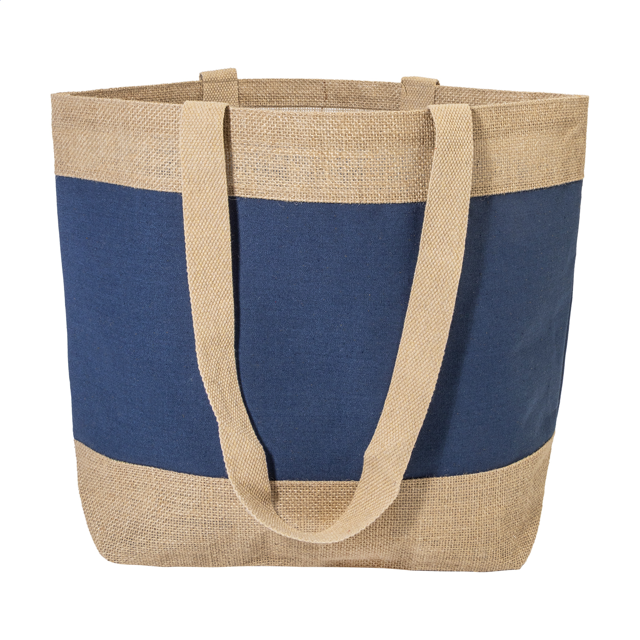 Borsa shopper da spiaggia colorata in combinazione di juta e cotone laminati con manici lunghi.