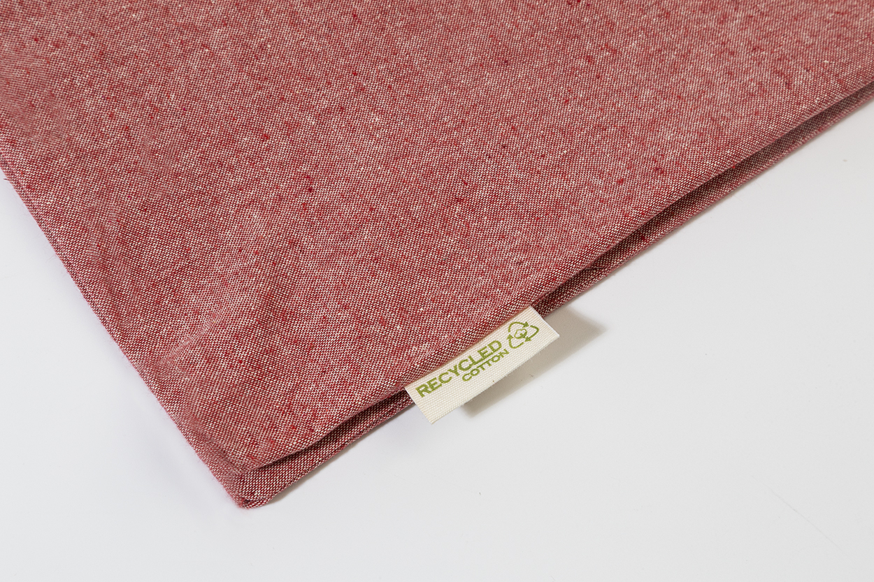 Borsa della spesa riutilizzabile in 100% cotone riciclato da140 g/m² con manici lunghi ed etichetta cotone riciclato.
