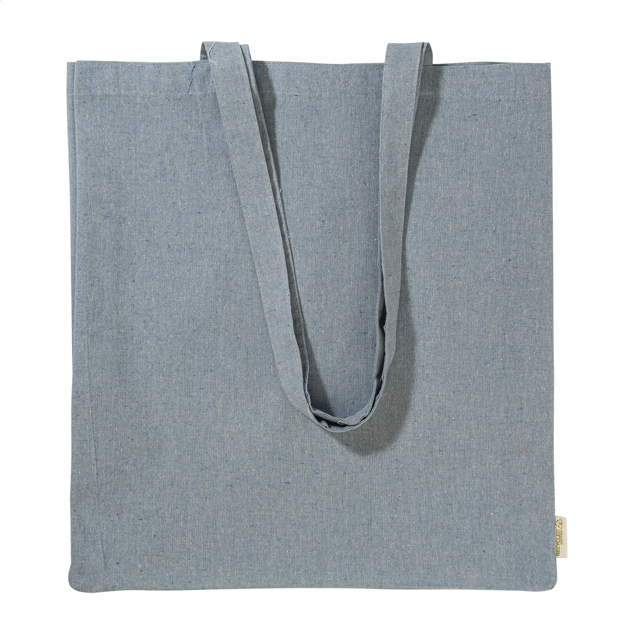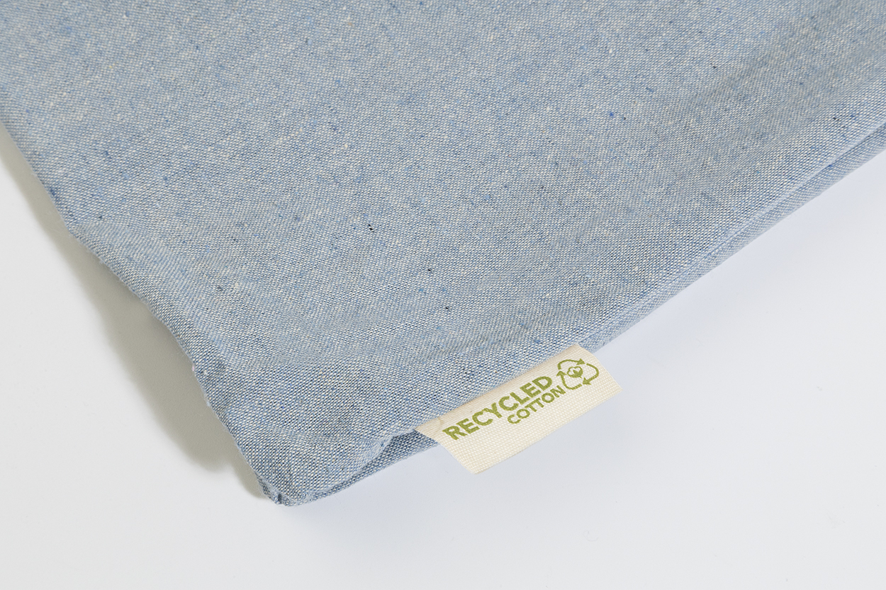 Borsa della spesa riutilizzabile in 100% cotone riciclato da140 g/m² con manici lunghi ed etichetta cotone riciclato.