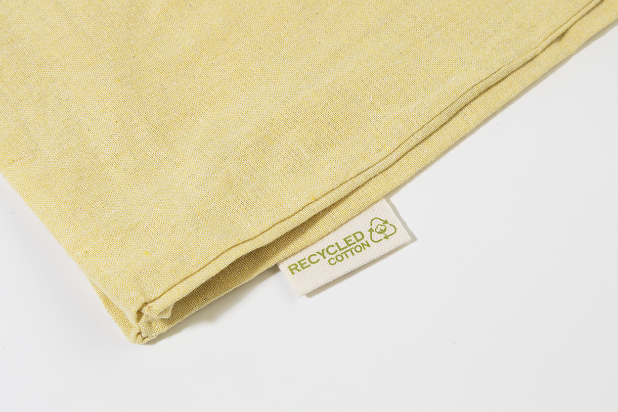 Shopper riutilizzabile in 100% cotone riciclato da140 g/m² con manici lunghi ed etichetta cotone riciclato.