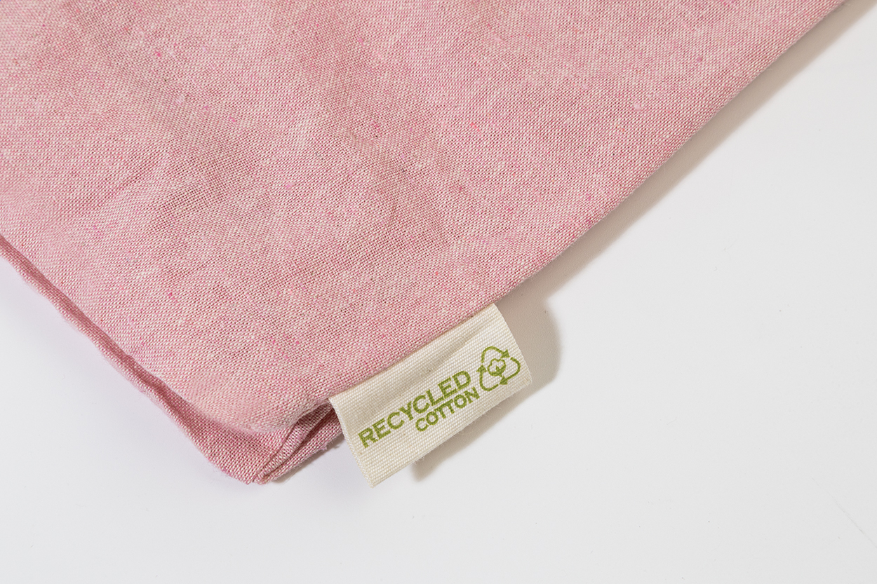 Shopper riutilizzabile in 100% cotone riciclato da140 g/m² con manici lunghi ed etichetta cotone riciclato.