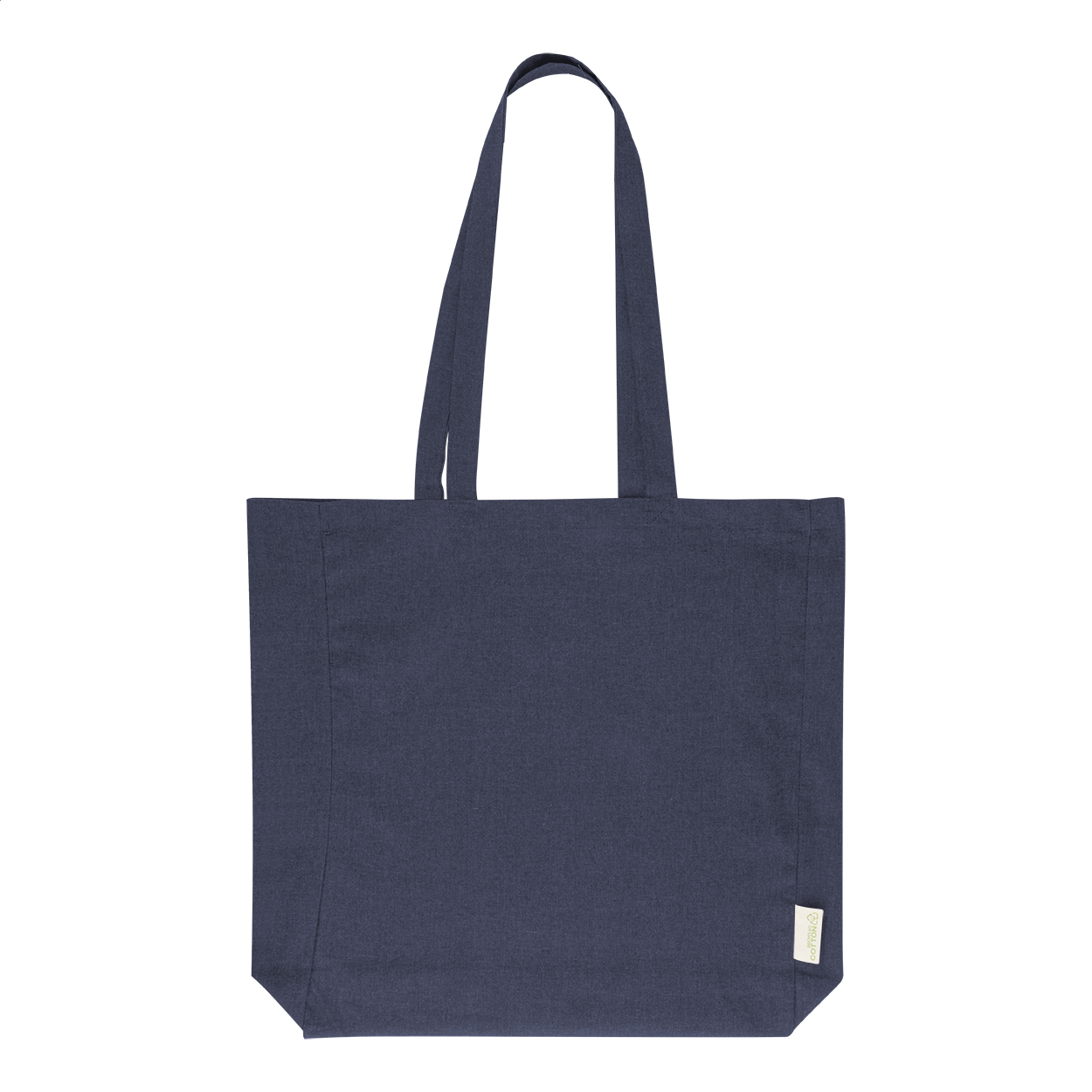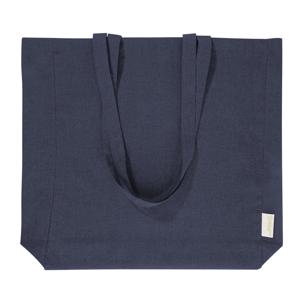 Shopper con soffietto e manici lunghi in 70% cotone riciclato e 30% poliestere RPET da 140 g/m² ed etichetta cotone riciclato.