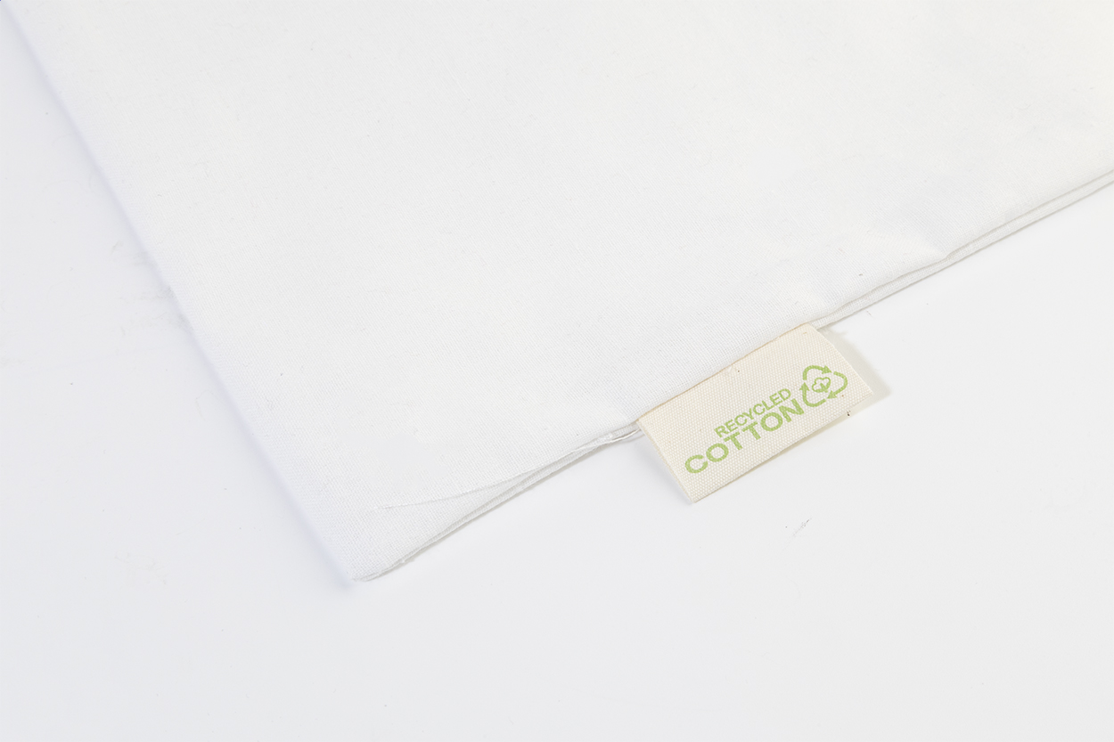 Shopper con manici lunghi in 70% cotone riciclato e 30% poliestere RPET da 140 g/m² ed etichetta cotone riciclato.