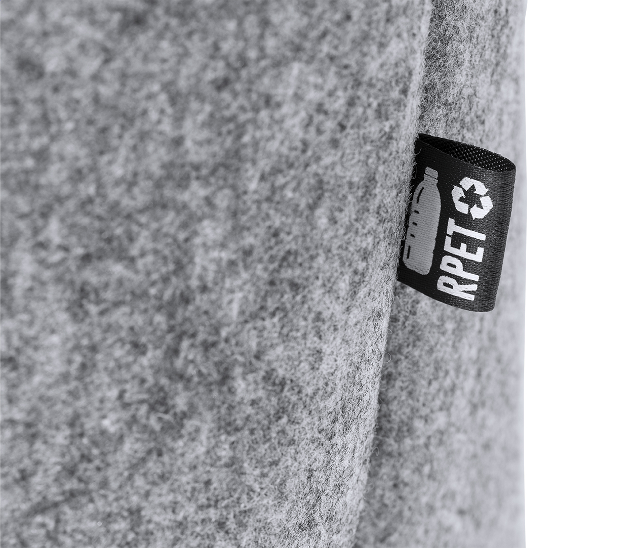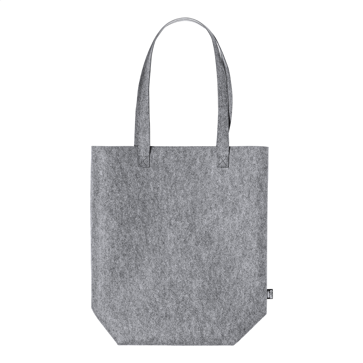 Shopper in feltro RPET con manici extra lunghi, soffietto sul fondo ed etichetta RPET.
