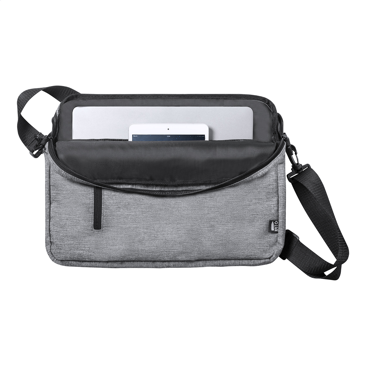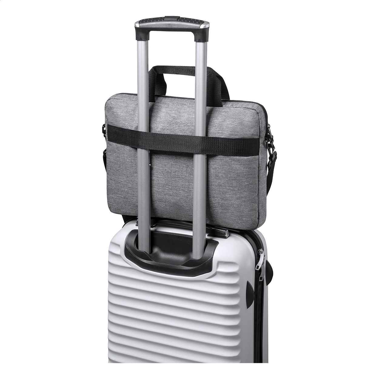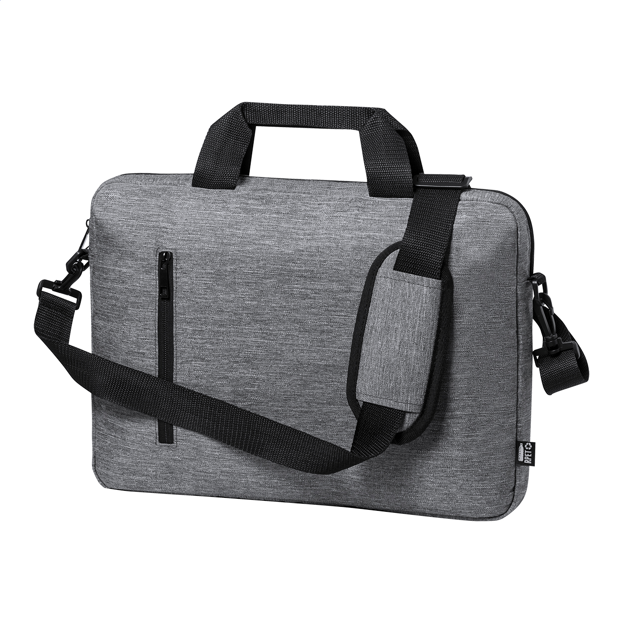 Borsa portadocumenti in poliestere 600D RPET con cerniera sulla tasca principale, tracolla regolabile, fascia trolley, scomparti imbottiti per laptop (15") e tablet (10").