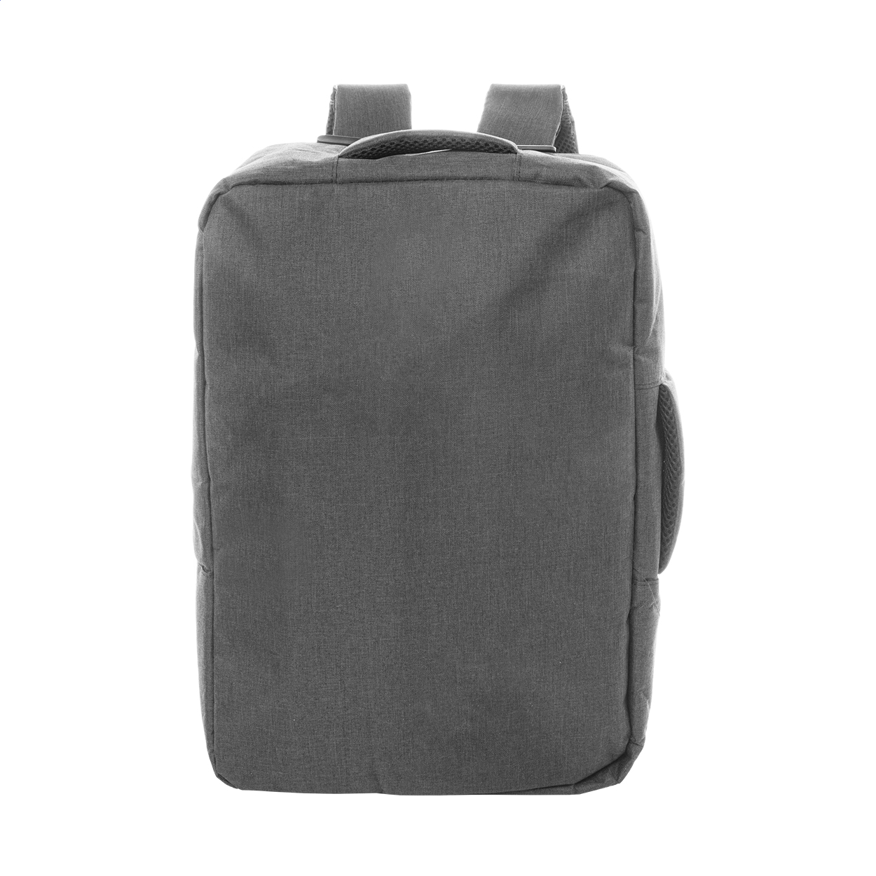 Zaino e borsa portadocumenti in poliestere 300D RPET con scomparto chiuso da cerniera, scomparto imbottito per laptop (15"), cinghia per trolley, schienale e spallacci imbottiti ed etichetta RPET.