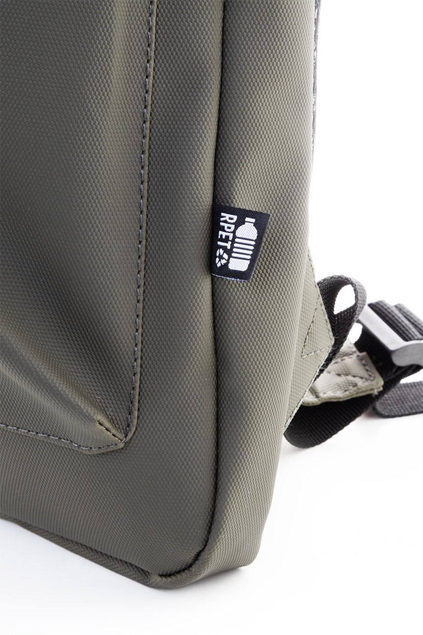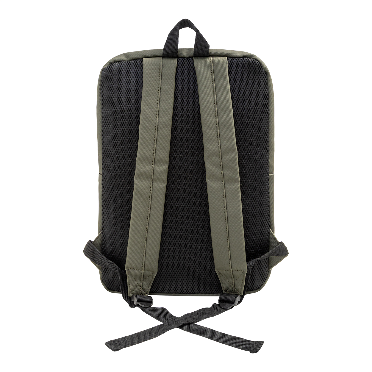 Sottile zaino impermeabile in poliestere 600D RPET con rivestimento in PU, scomparto per computer portatile (15") e tasca frontale chiusi da con cerniera, schienale e spallacci imbottiti ed etichetta RPET.