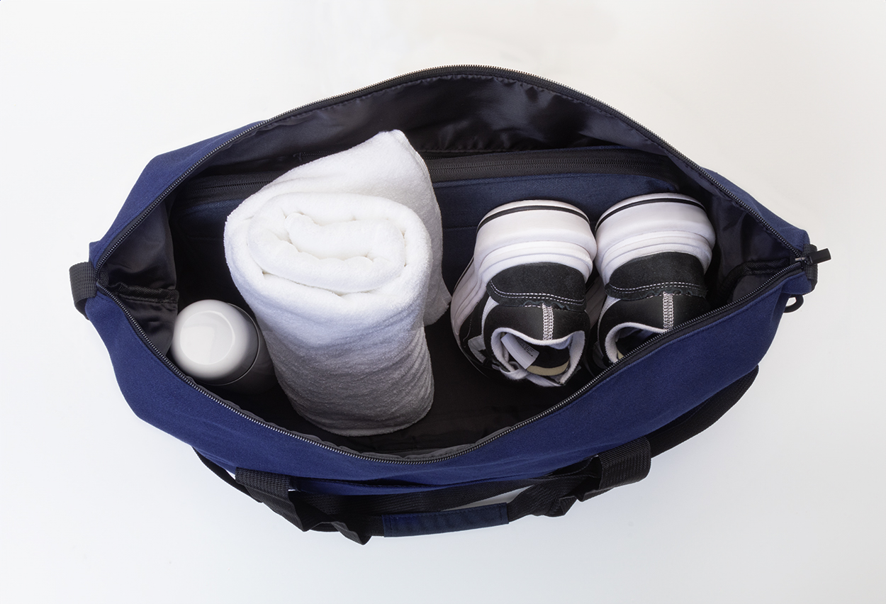Borsa sportiva da viaggio in tela riciclata con scomparto principale chiuso da cerniera, tasca frontale, tracolla regolabile e tasca posteriore chiusa da cerniera con funzione anche di cinghia per trolley. 70% cotone riciclato e 30% poliestere RPET. Etichetta cotone riciclato.