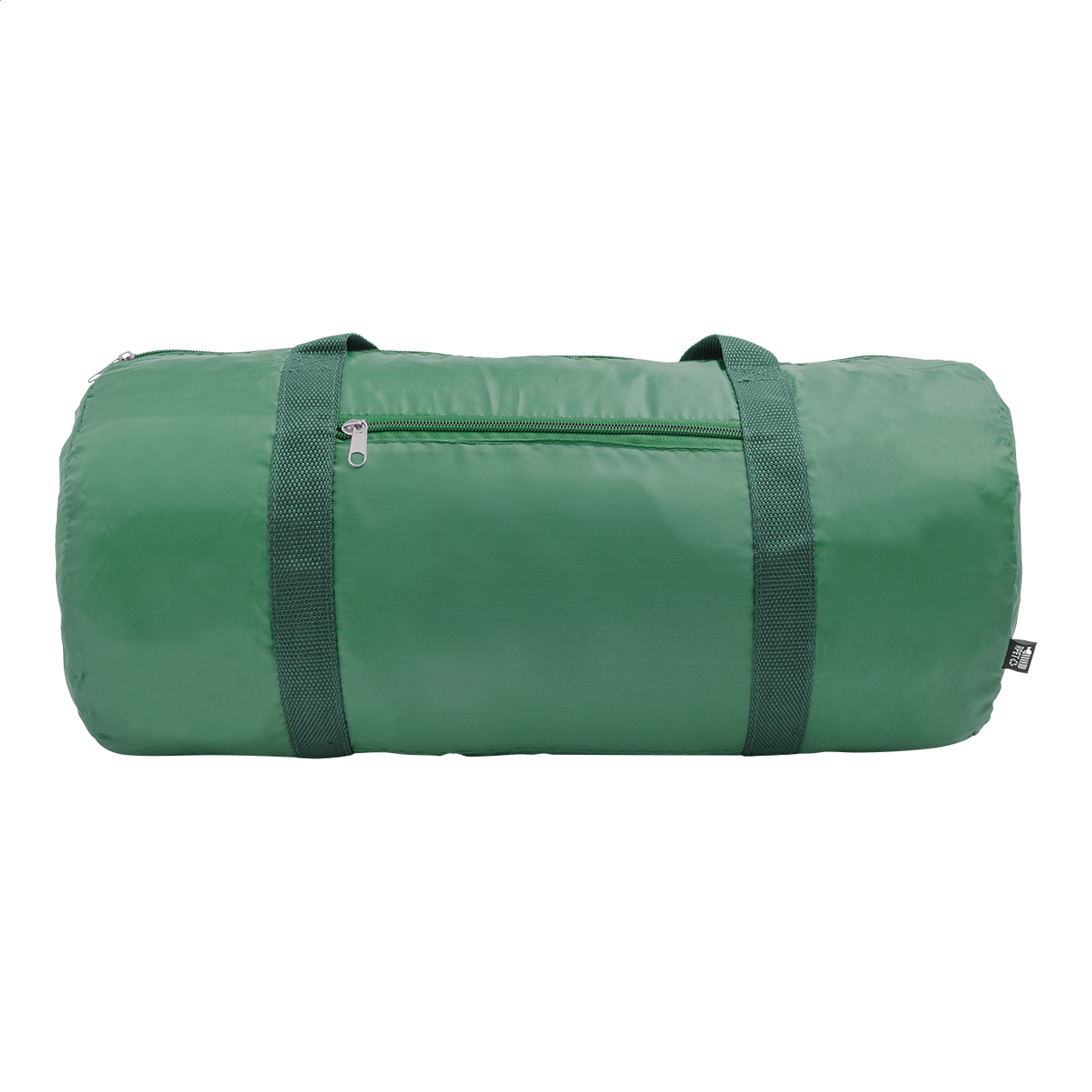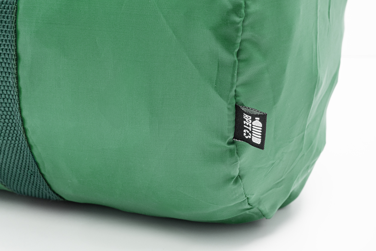 Borsa sportiva in poliestere RPET 190T con scomparto principale e tasca anteriore chiusa da cerniera, manici lunghi ed etichetta RPET.